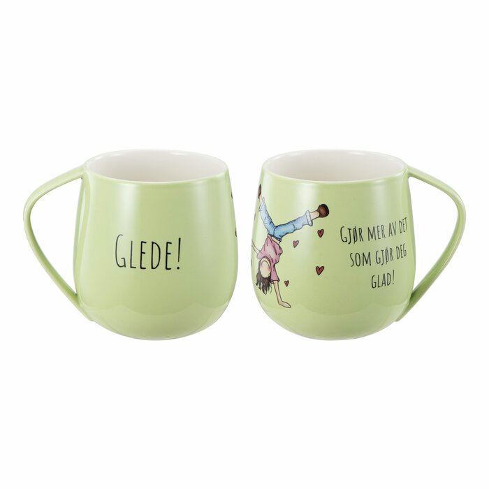 Start dagen med et smil – denne nydelige kruset fra Lykketegning er dekorert med teksten «Glede!» på den ene siden og «Gjør mer av det som gjør deg glad!» på den andre, sammen med en sjarmerende illustrasjon i ekte Lykketegning-stil. Den friske grønne fargen og runde formen gjør koppen både koselig og god å holde i – perfekt til kaffe, te eller kakao. Kommer i en dekorativ gaveeske.
