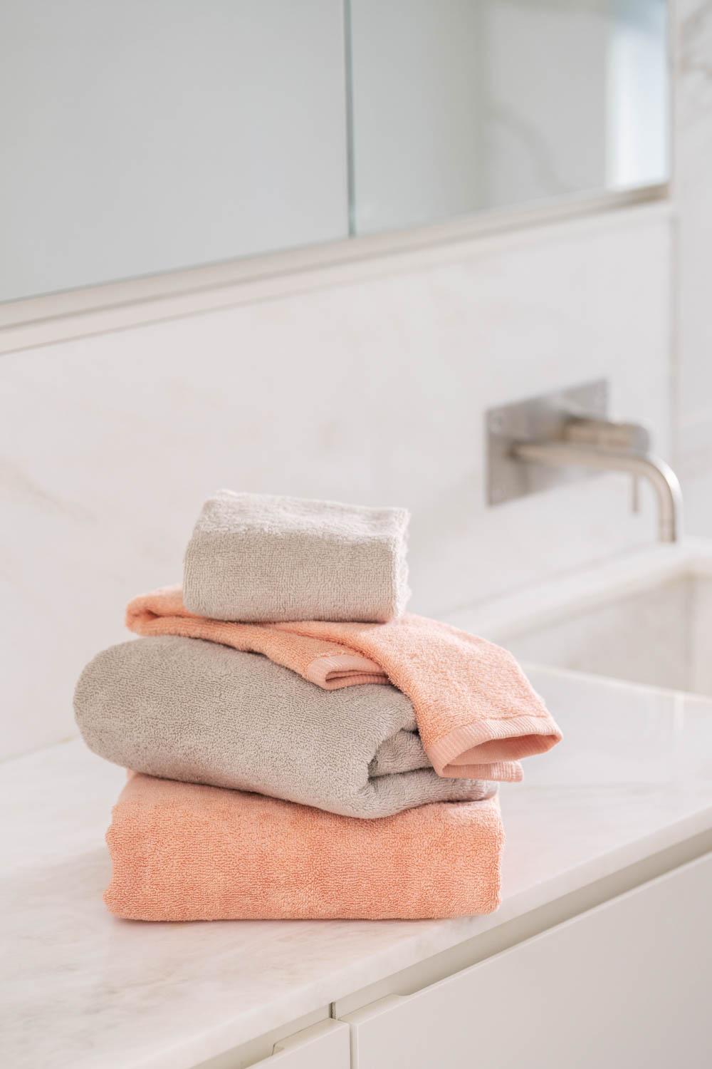 Myke håndklær i lun frotté i duse farger er med på å skape en lun atmosfære på badet. Om du ikke velger samme farge på alle håndklærne, pass på å ha farger som matcher for å bevare en ryddig og harmonisk følelse.
