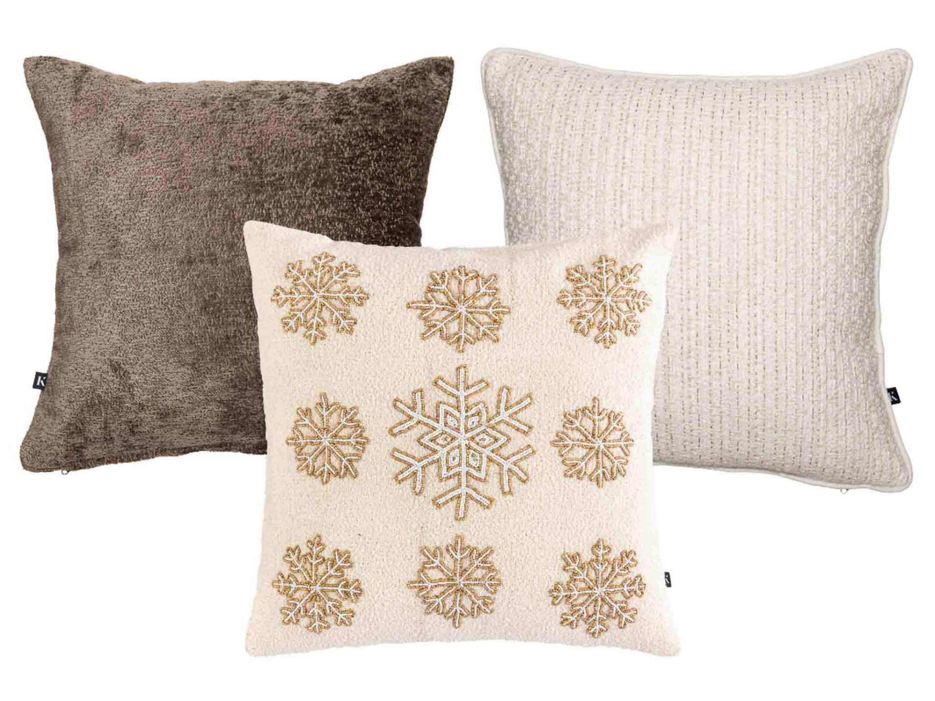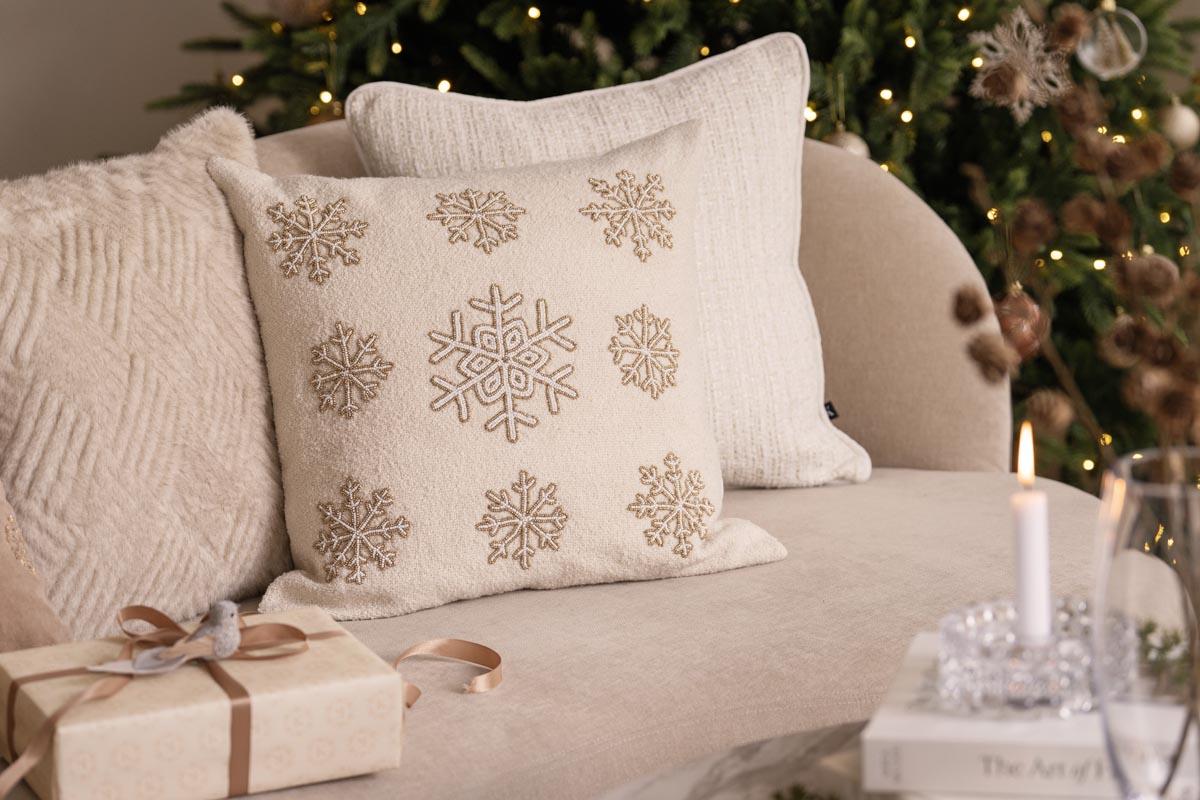 EN kombinasjonen skaper en rolig og varm julefølelse med lyse kremtoner kombinert med dypere, lune nyanser. Den broderte snøkrystallputen gir et elegant vinterpreg med et hint av gull som gir et festlig løft. De ensfargede putene i myke strukturer balanserer uttrykket og gir en harmonisk helhet. Perfekt for deg som ønsker en rolig, koselig og stilren julestemning i sofaen.