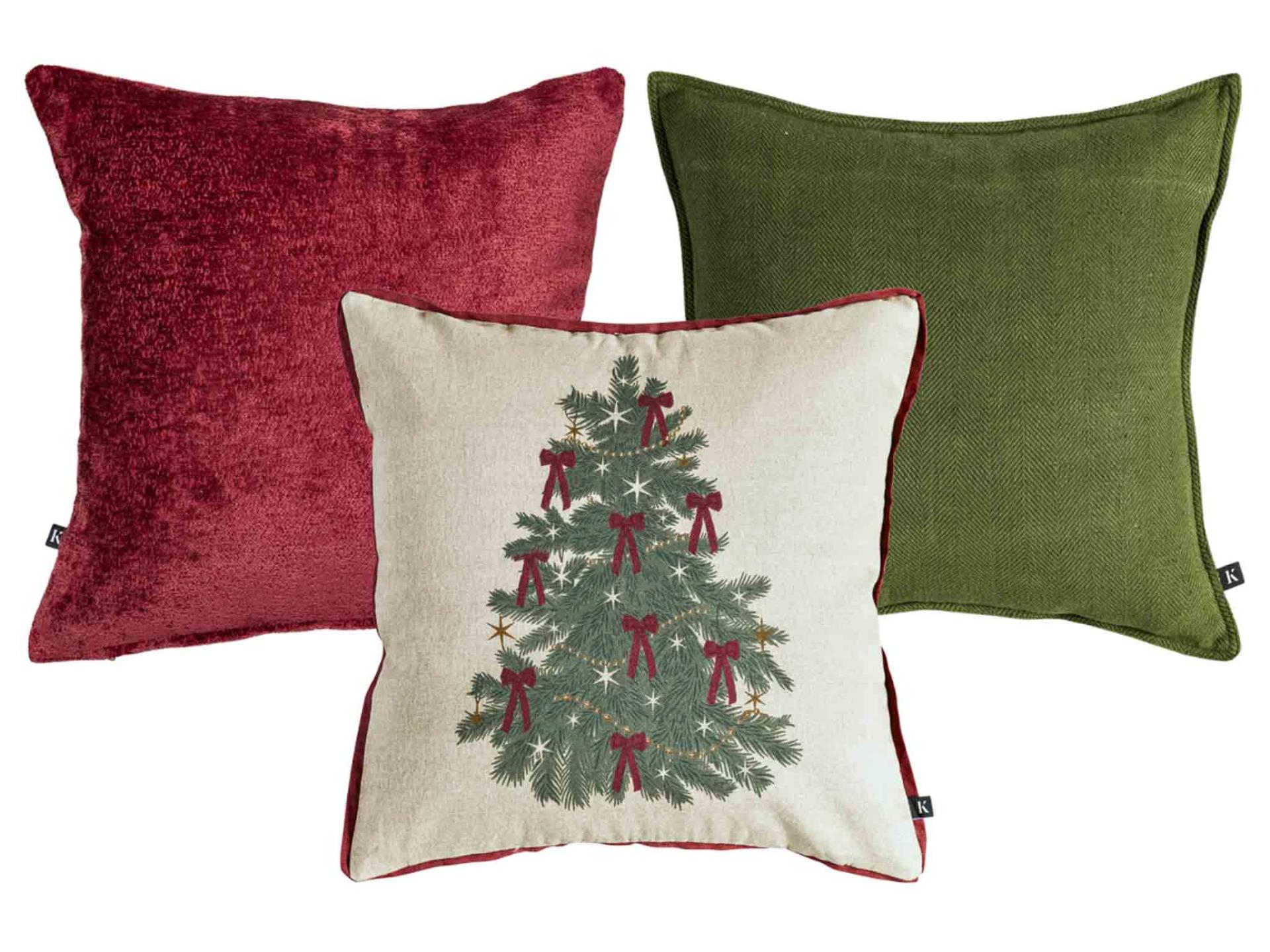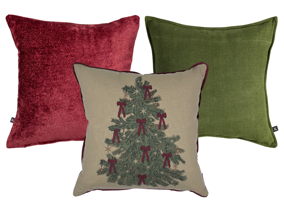 Denne kombinasjonen gir stuen et tidløst julepreg med dype røde og grønne nyanser. Putetrekket med juletre står i sentrum og skaper en nostalgisk og koselig stemning. Den røde velurputen tilfører varme og fylde, mens den grønne strukturen balanserer uttrykket på en rolig og harmonisk måte. Perfekt for deg som ønsker en klassisk julefølelse med tradisjonell sjarm.