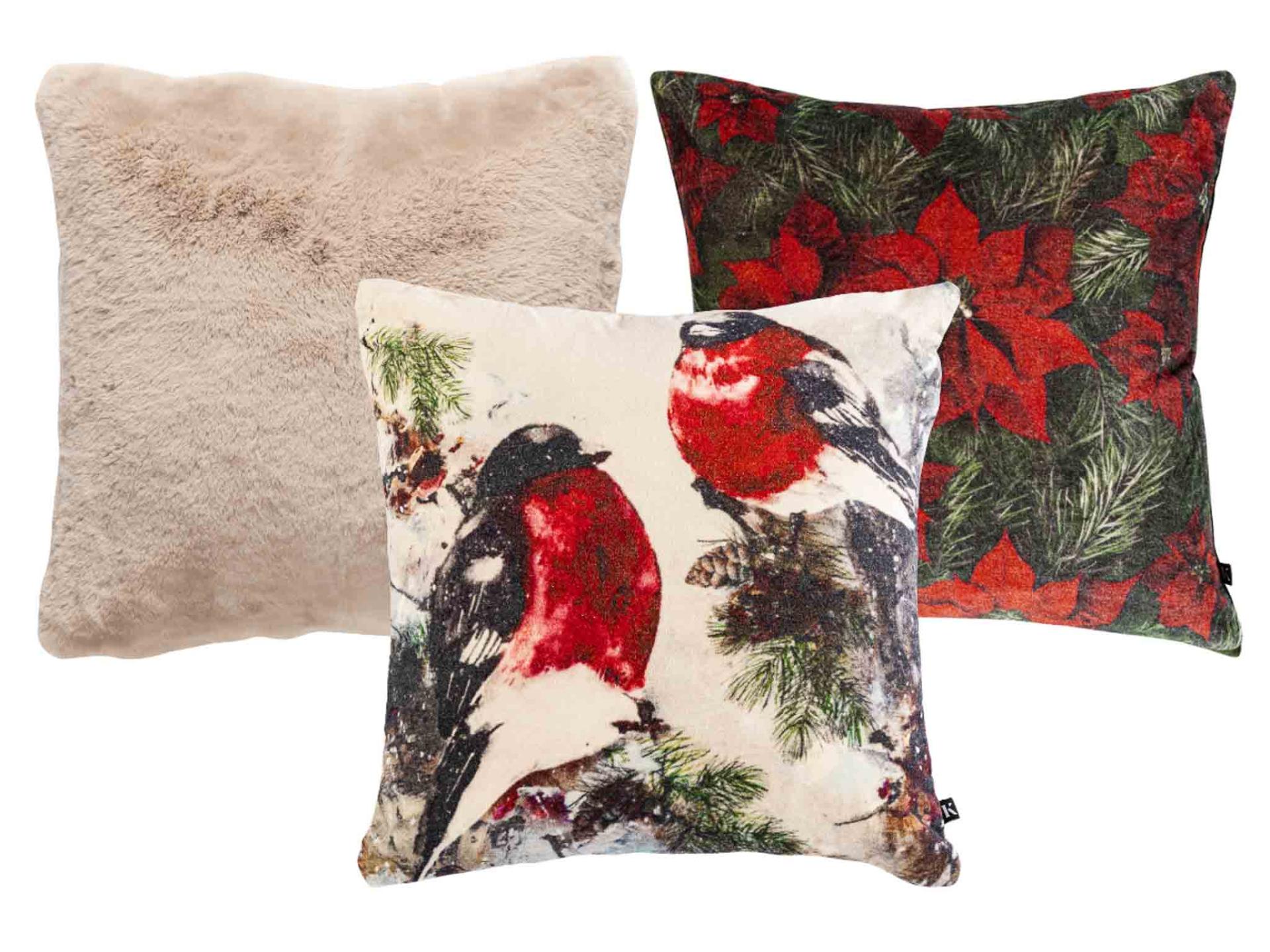 Den klassiske vinterfølelsen med dompaper som hovedmotiv – et symbol på julefred og naturens ro. Den blomstrete puten med røde julestjerner tilfører dybde og tradisjonell julemagi. Den myke, beige fuskepelsputen gir en lun og inviterende kontrast som gjør helheten ekstra koselig. Perfekt for deg som ønsker en varm og nostalgisk julestemning i stua.
