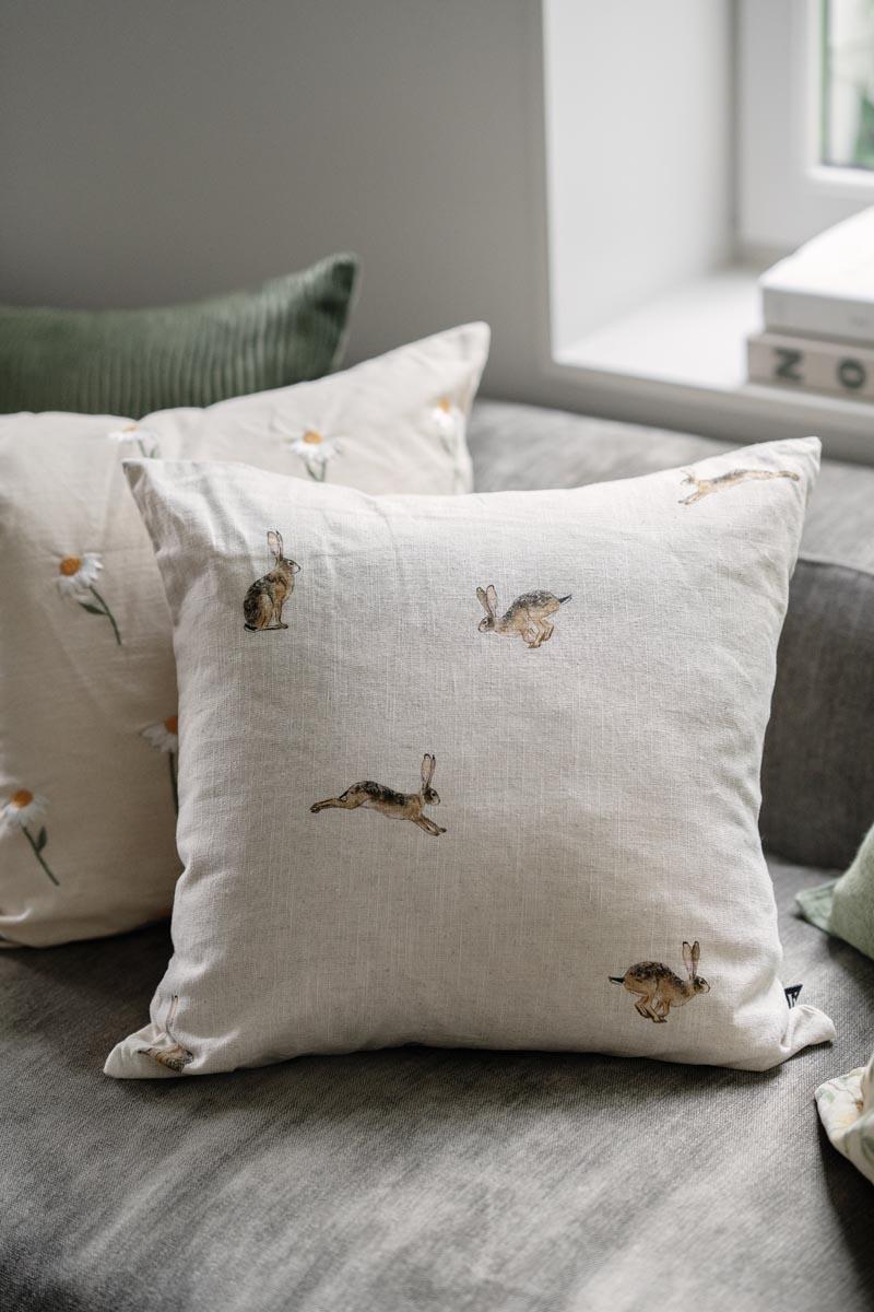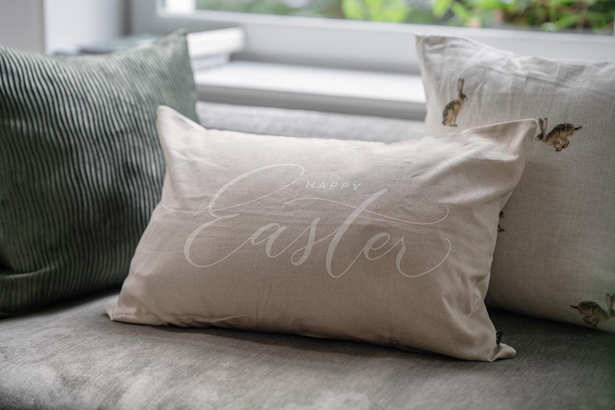 En diskre og enkel påspynt er nydelige putetrekk i sofaen med dempet påskemotiv og lune farger.