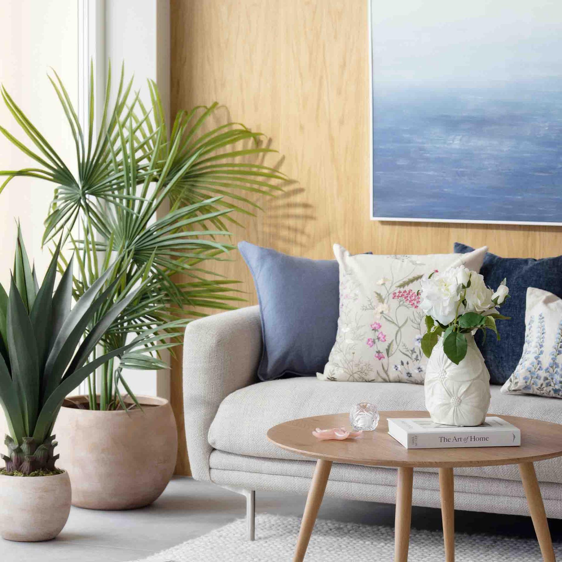 Skandinavisk ro møter lette sommertoner i en lun og harmonisk stil. Blått, beige og myke rosanyanser gir et lyst og balansert uttrykk.