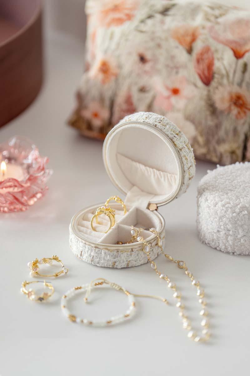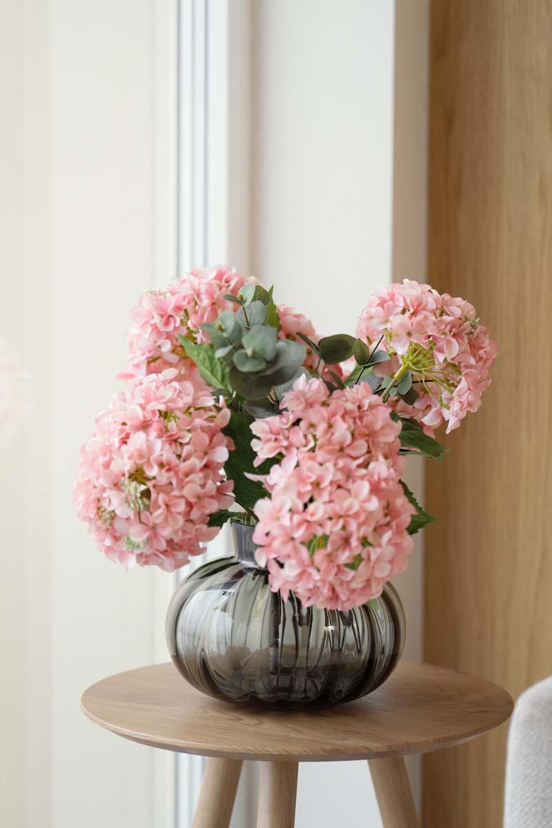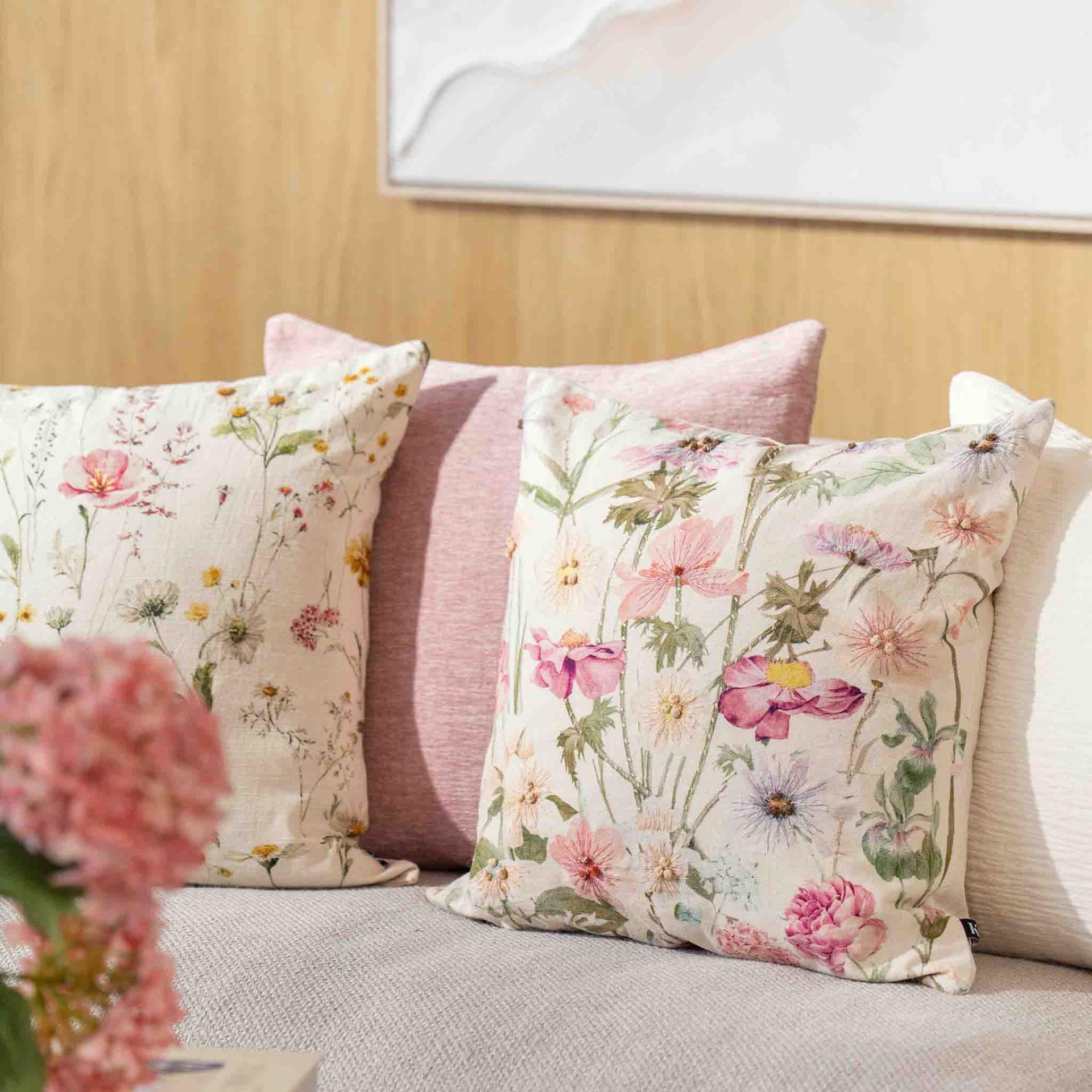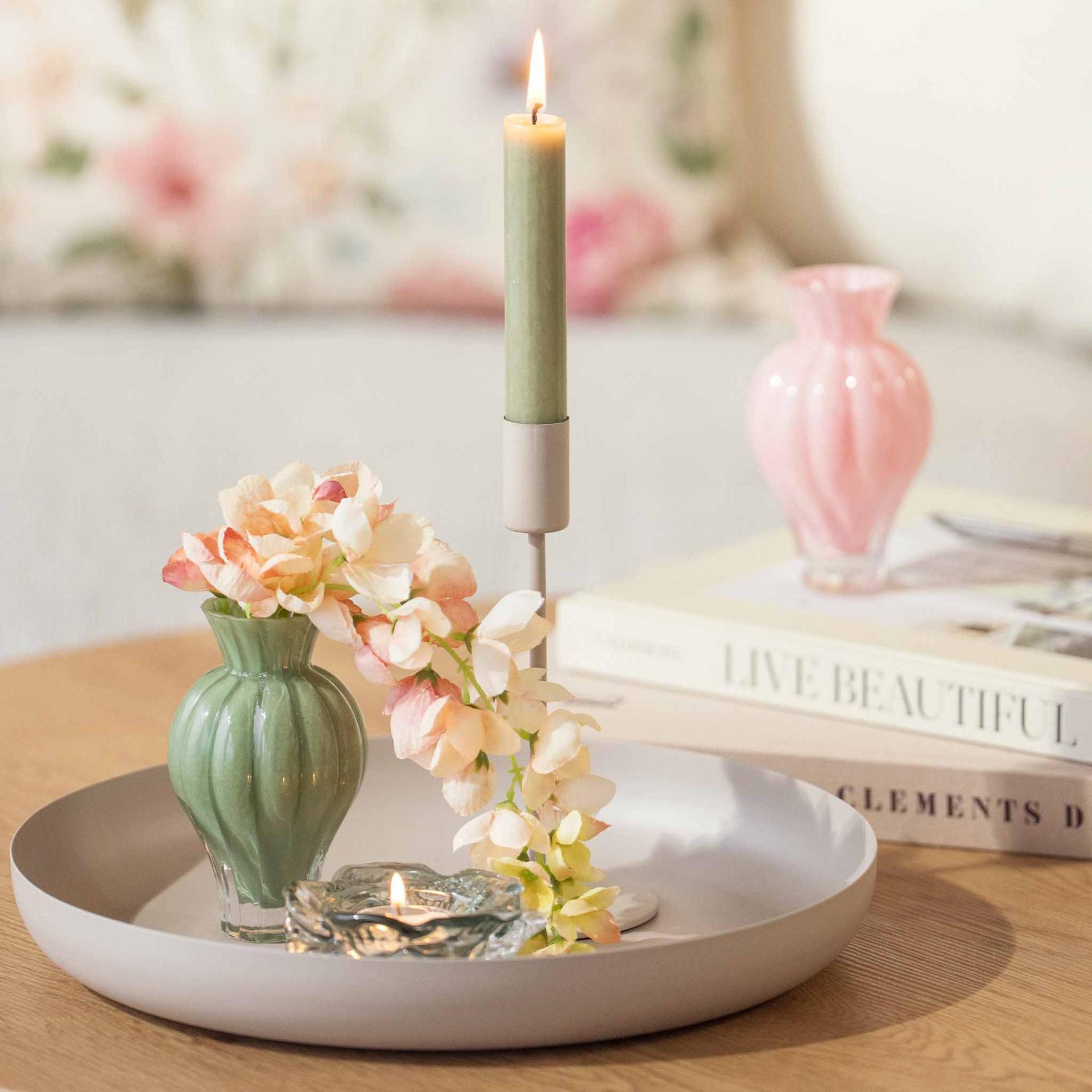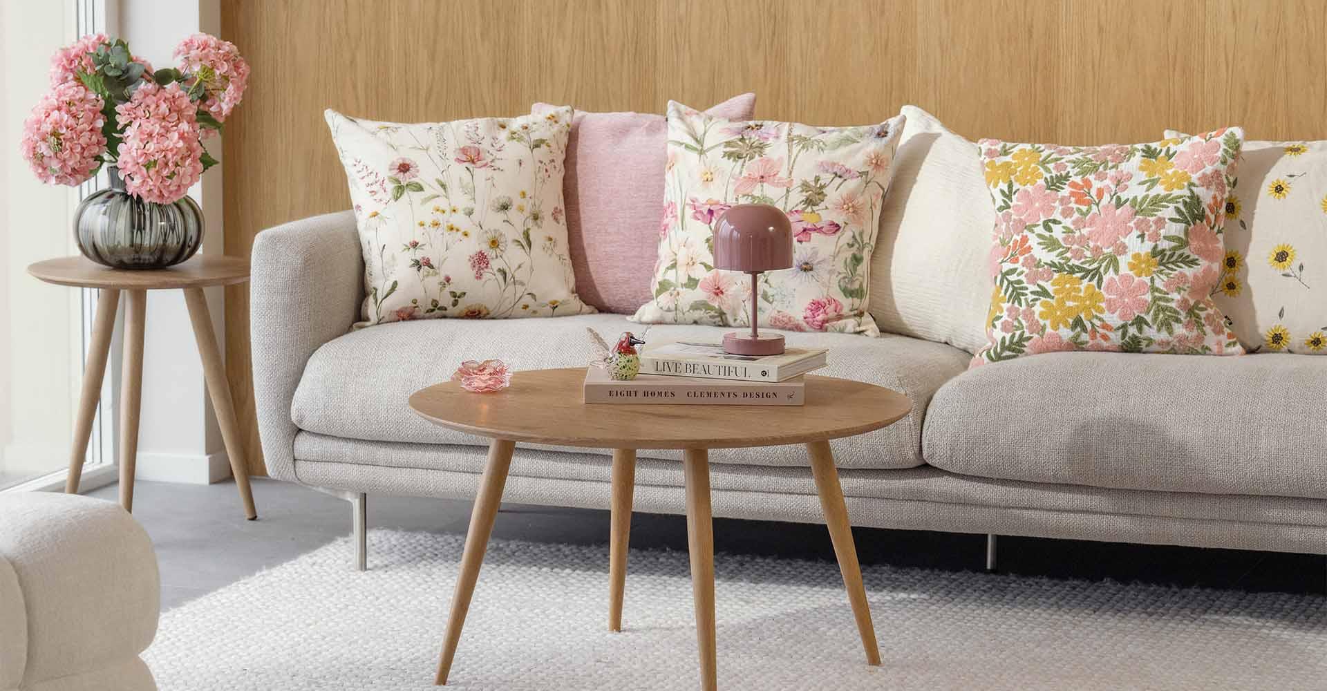 Rustikke materialer møter myke tekstiler og skaper en rolig kontrast som gir dybde. Fargene henter toner fra sommerens blomster, med grønne nyanser, dempet rosa og et forsiktig hint av fersken. Keramikk med blank overflate og tekstiler med ulike strukturer gir liv til uttrykket, sammen med innslag av farget glass. Lyst treverk samler helheten og lar de ton-i-ton fargene og de små mønstrene komme fint frem.