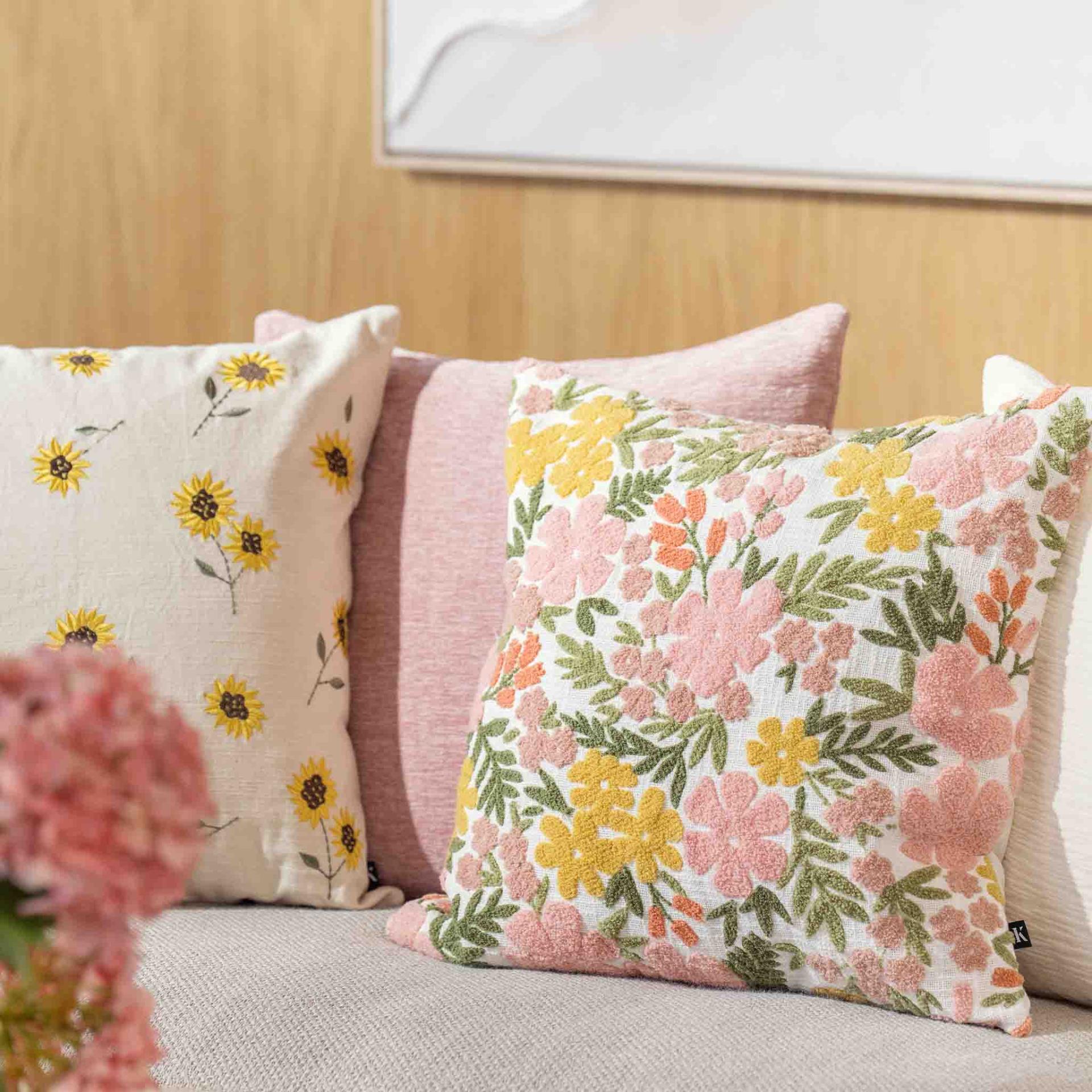 Tekstiler i chenille, lin og bomull med blomsterprint og broderi