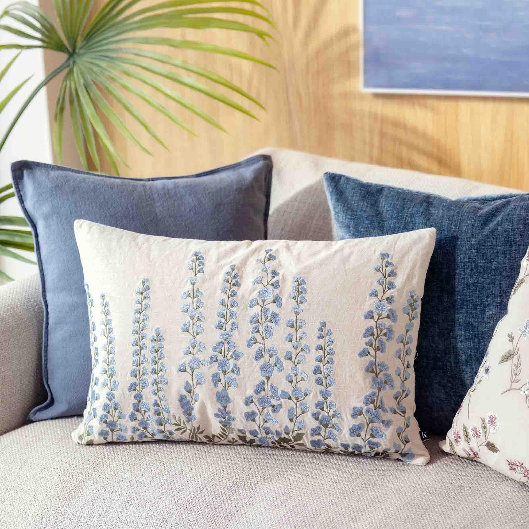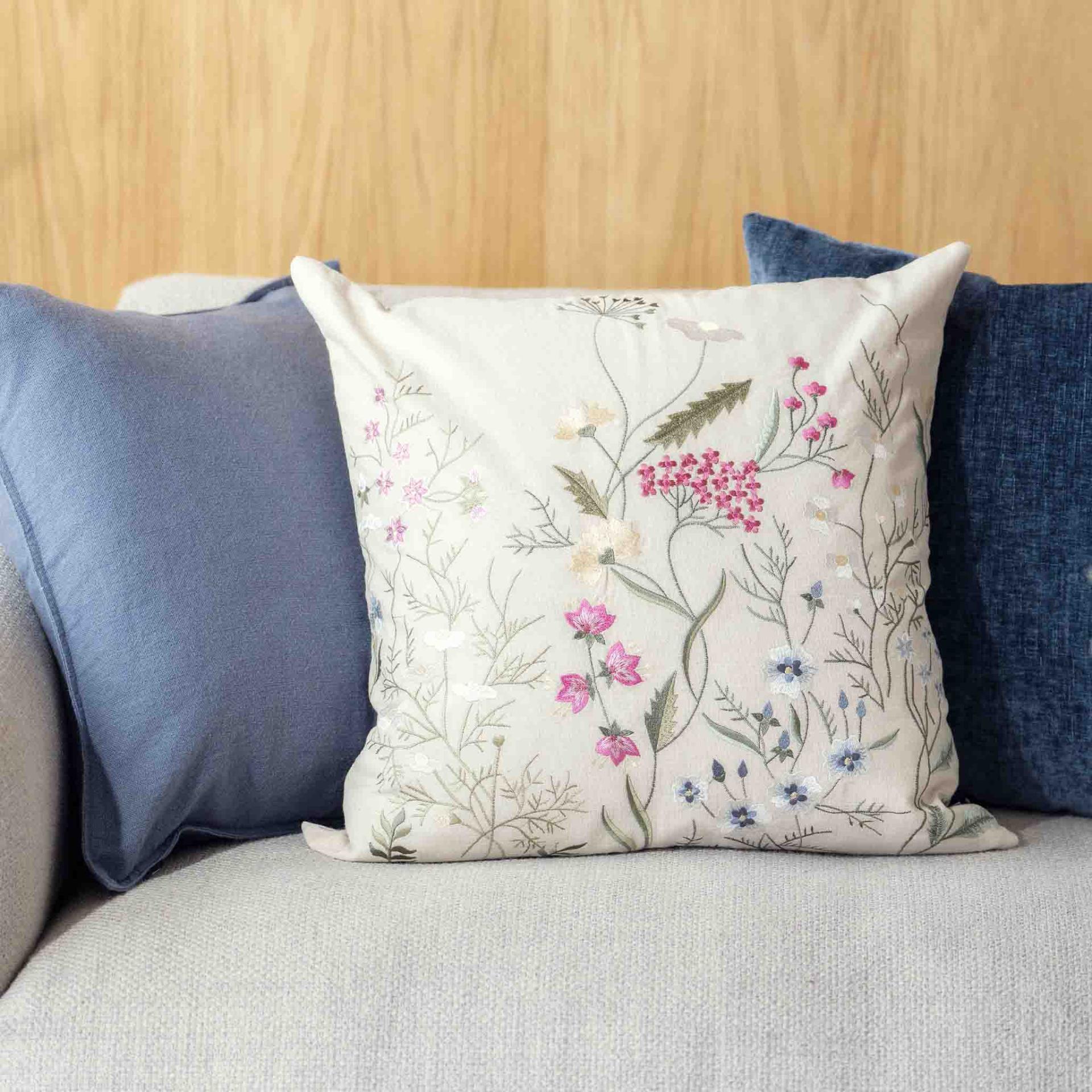 Tekstiler i bomull, lin og chenille med minimalistisk blomsterprint og broderi