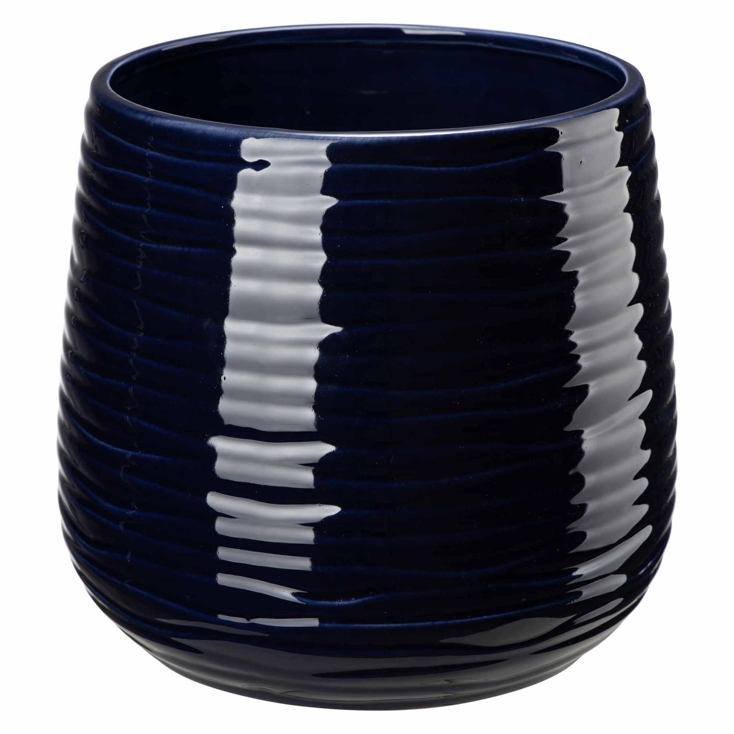 En elegant utepotte med dyp, blå glasur og myke riller som fanger lyset på en vakker måte. Ida har et tidløst og rolig uttrykk som gir uteplassen et sofistikert løft, samtidig som den tilfører farge og dybde.