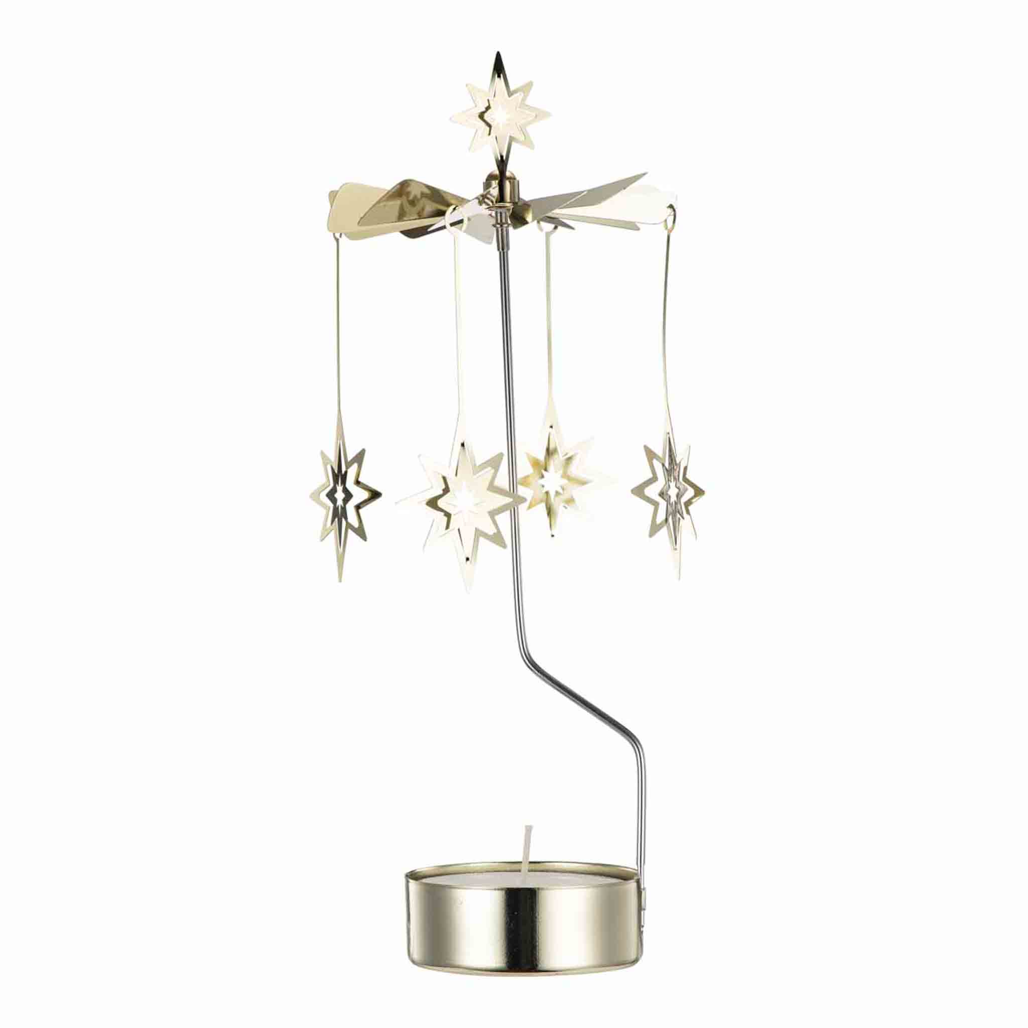 Nydelig englespill i gullfarget metall. Tenn telyset og se stjernene danse rundt og rundt. Plasser på lysfat og pynt klart til jul med herlig julepynt og dekorasjoner.