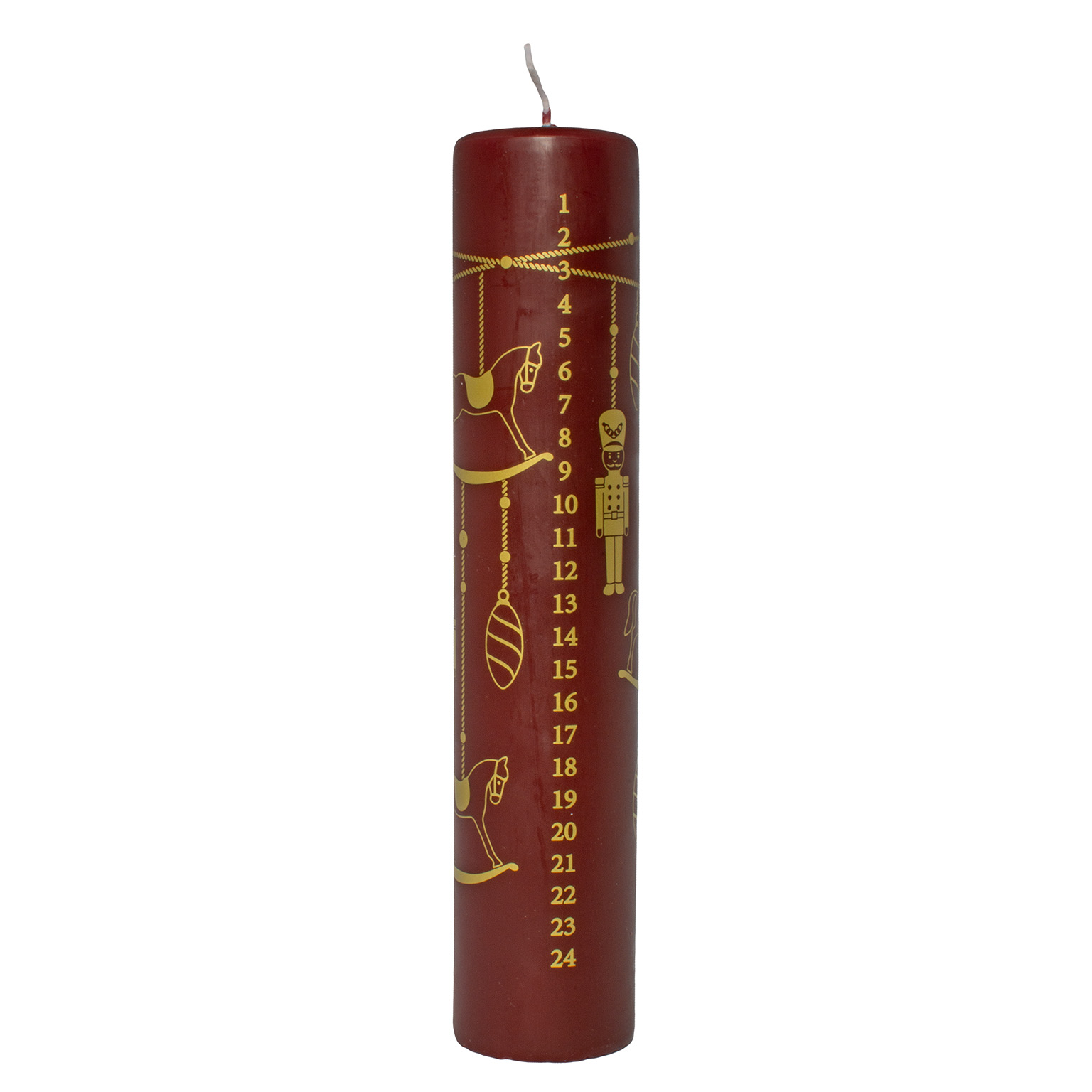 Kalenderkubbelys i dyp rød med gullmotiv og tall fra 1–24. Tenn lyset litt hver dag og tell ned til julaften på en stemningsfull måte. Perfekt for adventshygge.