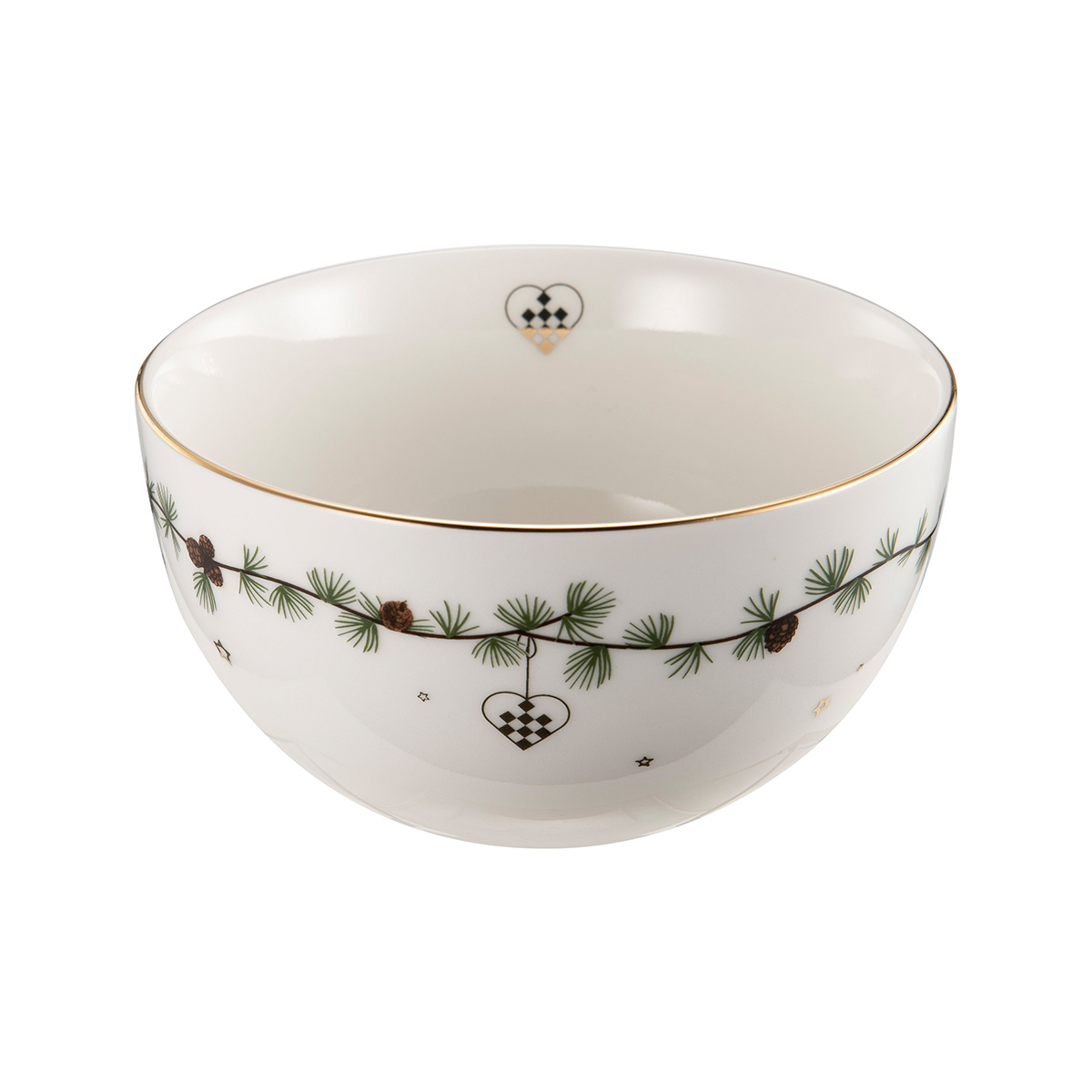 En nydelig juleskål dekorert med kongler, granbar og julehjerter i duse toner og detaljer i gull. Passer like godt til frokost som til julekvelden. Kombiner gjerne med matchende servise for en helhetlig juledekket bord.