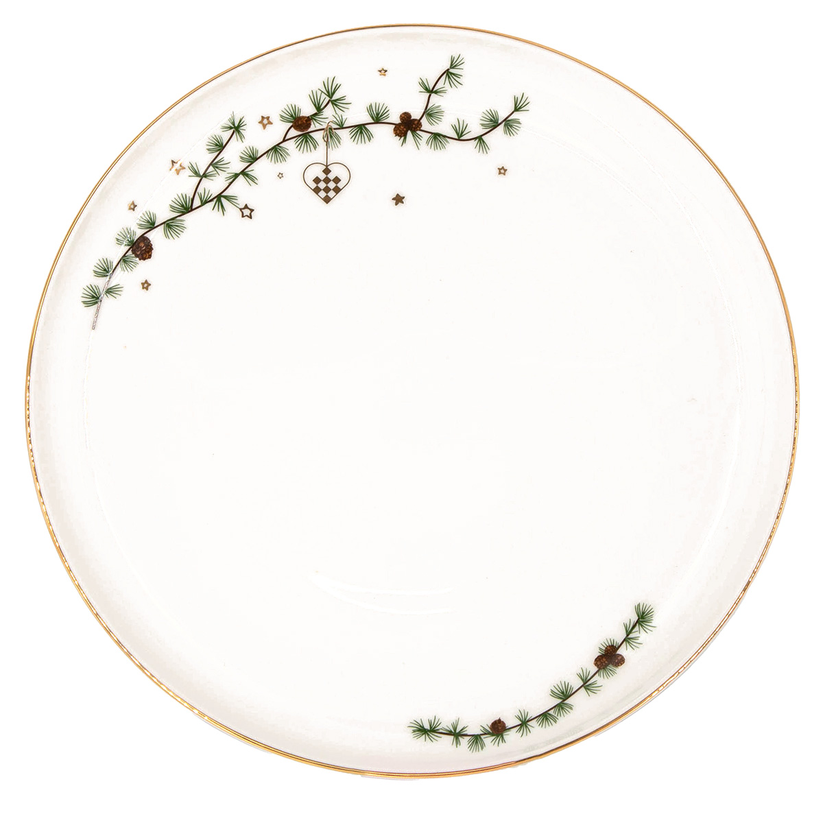 Elegant middagstallerken med klassisk julemotiv i grønt, gull og brunt. De fine detaljene med kongler, stjerner og julehjerte gir en varm og tradisjonell stemning til julemåltidet. Match gjerne med resten av serviset for en helhetlig borddekking.