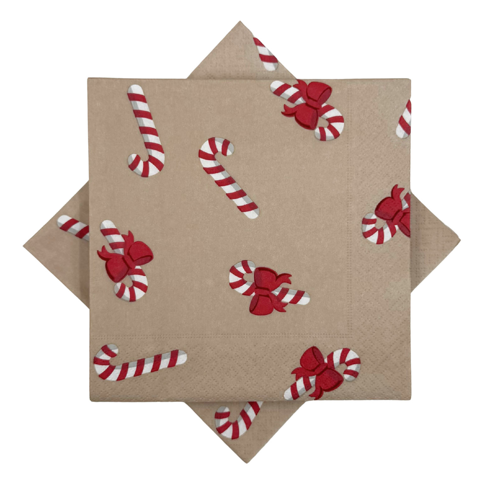 Serviett med beige bunn og klassiske candy canes i rødt og hvitt, noen pyntet med sløyfe. En leken og søt detalj til julebordet eller pepperkakefesten.