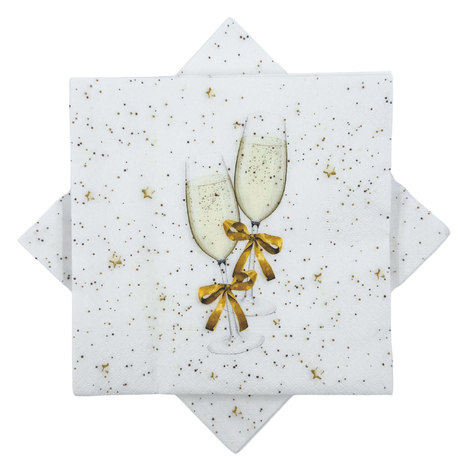 Hvit serviett med to champagneglass pyntet med gullsløyfer og stjernestrø i bakgrunnen. Et stemningsfullt innslag til nyttårsfeiringen eller festbordet.