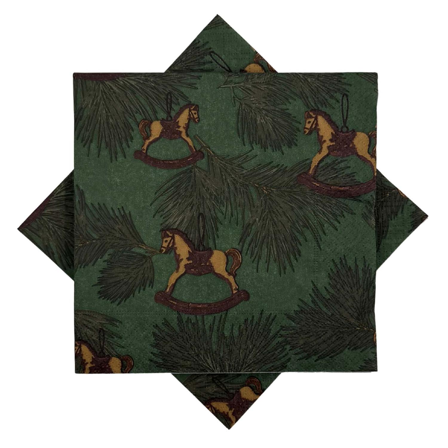Papirserviett med nostalgisk gyngehest og grønne barnåler på mørkegrønn bakgrunn. En klassisk julefavoritt som setter stemningen ved bordet.