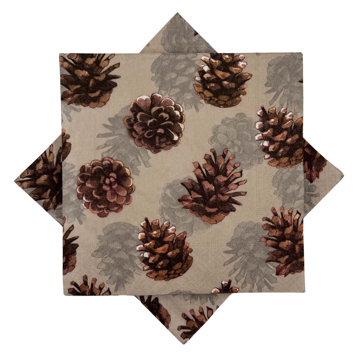 Papirserviett med koselig konglemønster i varme bruntoner. Perfekt til vinterlige borddekkinger eller som et lunt innslag til julemåltidet.
