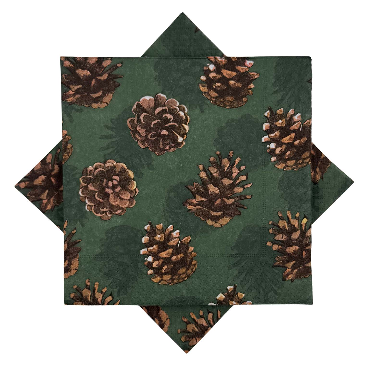 Papirserviett med klassisk konglemønster på mørkegrønn bakgrunn. Skaper en lun og naturlig stemning rundt bordet. Perfekt til både jul og vintermiddager.