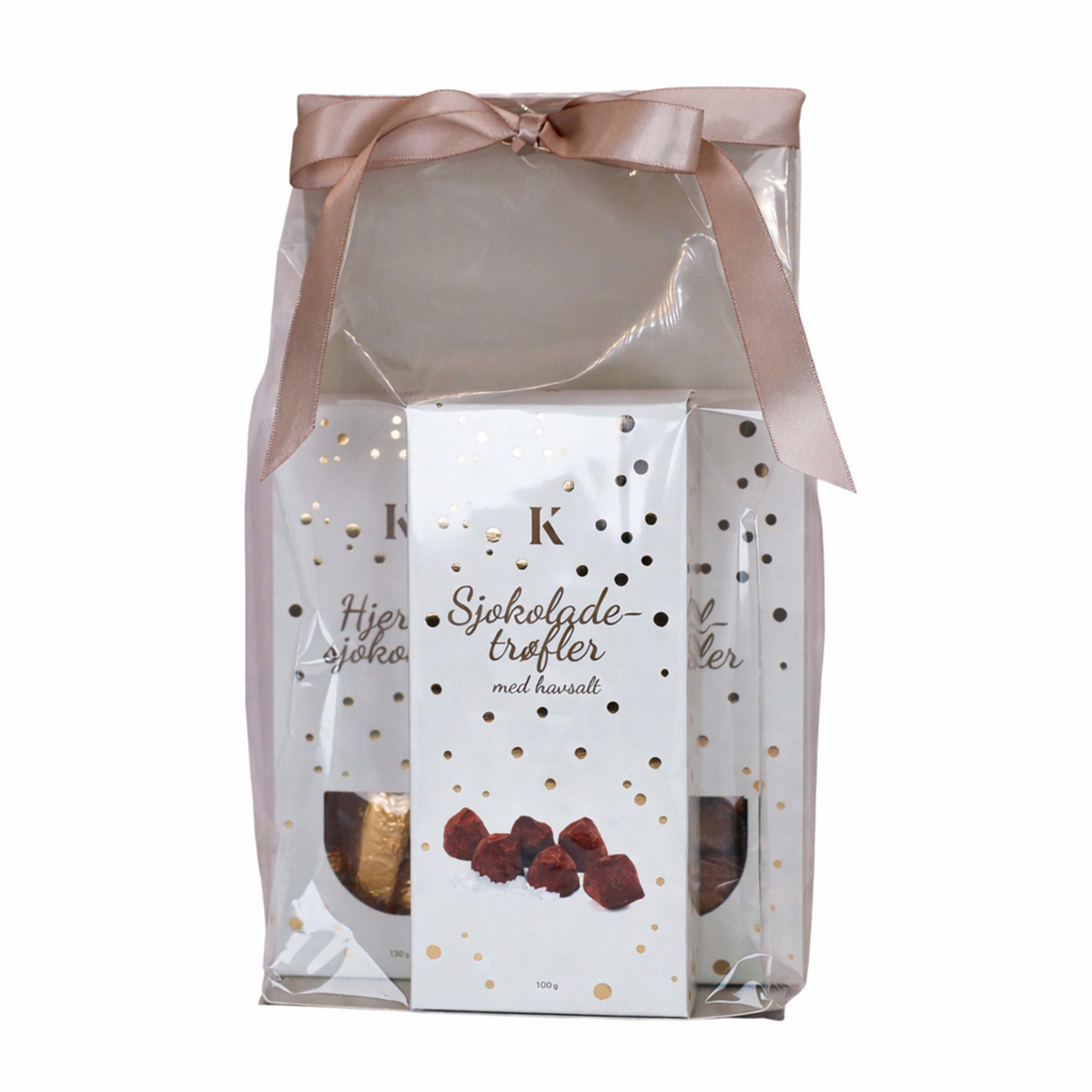 Denne gavepakken inneholder en smakfull kombinasjon av hjertesjokolade, kanelmandler og sjokoladetrøfler med havsalt. Alt er pakket i en stilfull og dekorativ gavepose med en flott sløyfe, klar til å gis bort til noen som fortjener noe ekstra godt til jul.