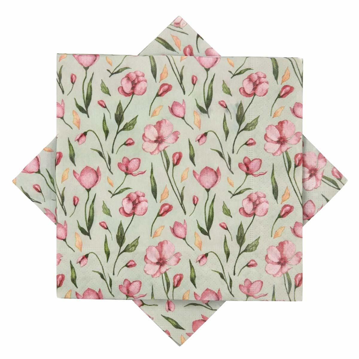 Servietter med rosa blomstermønster som gjør seg fint på bordet og skaper en lun og hyggelig stemning.