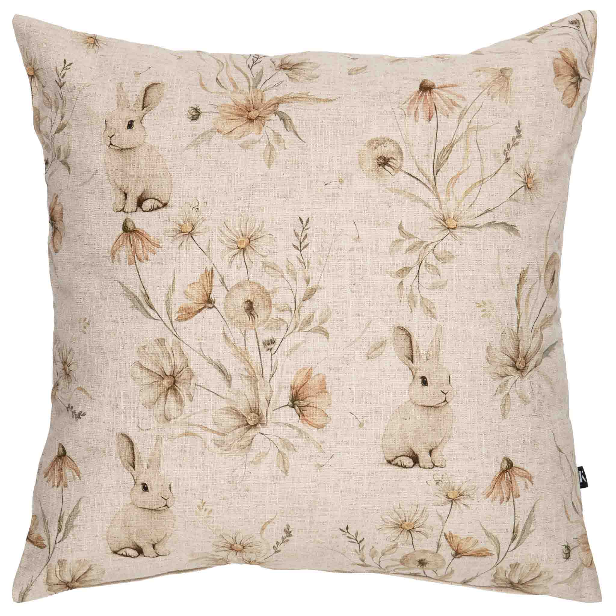 Et putetrekk i lyse naturtoner med et mykt mønster av blomster og små kaniner. Det rolige uttrykket og den dempede fargepaletten gir puten et lett og behagelig vårpreg. Enkelt å kombinere med ensfargede puter i beige, grønt eller gule nyanser. En fin måte å gi rommet et løft til påske.