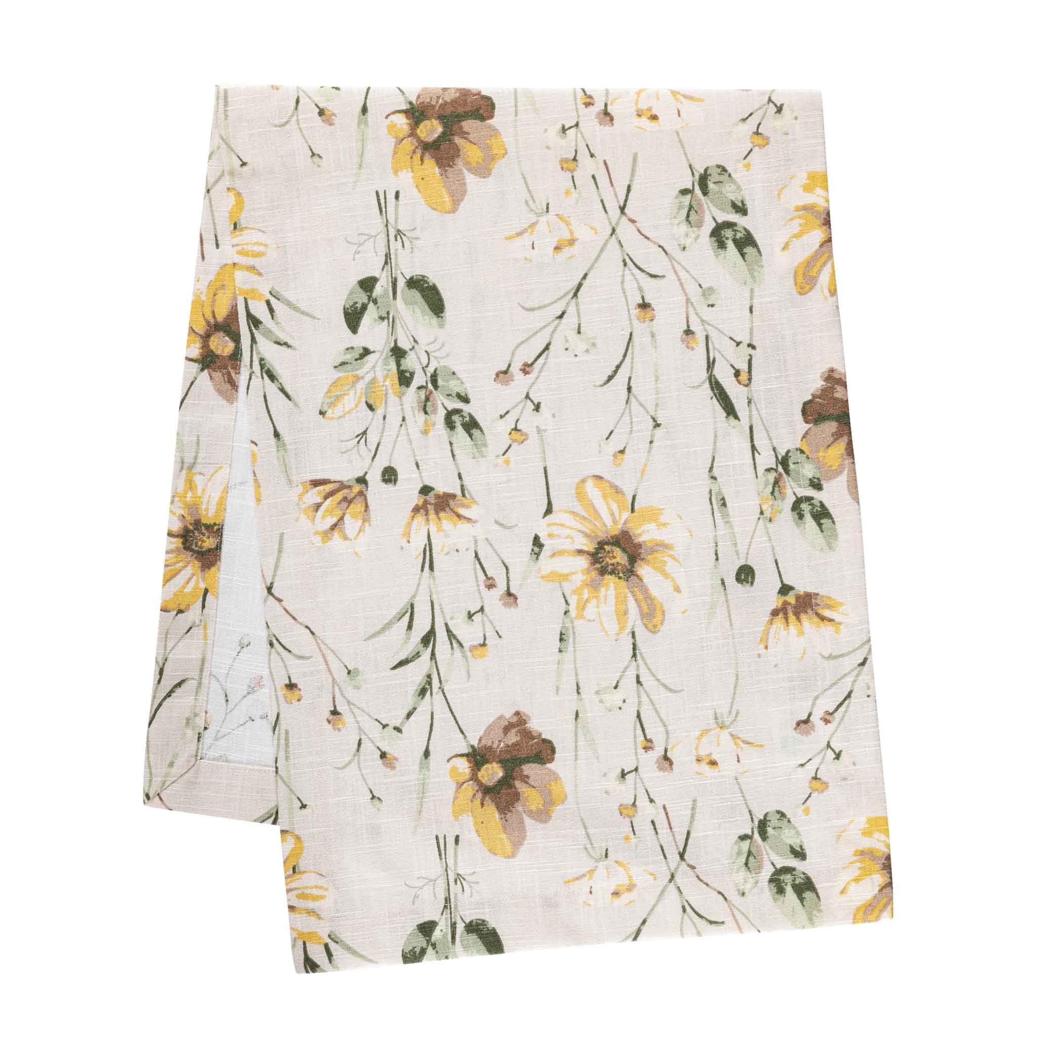 Løper i lyst tekstil med et mykt blomstertrykk i gule og grønne toner. Mønsteret gir bordet en lett og naturlig look som passer godt til både hverdagsbruk og sesongens dekkede bord.