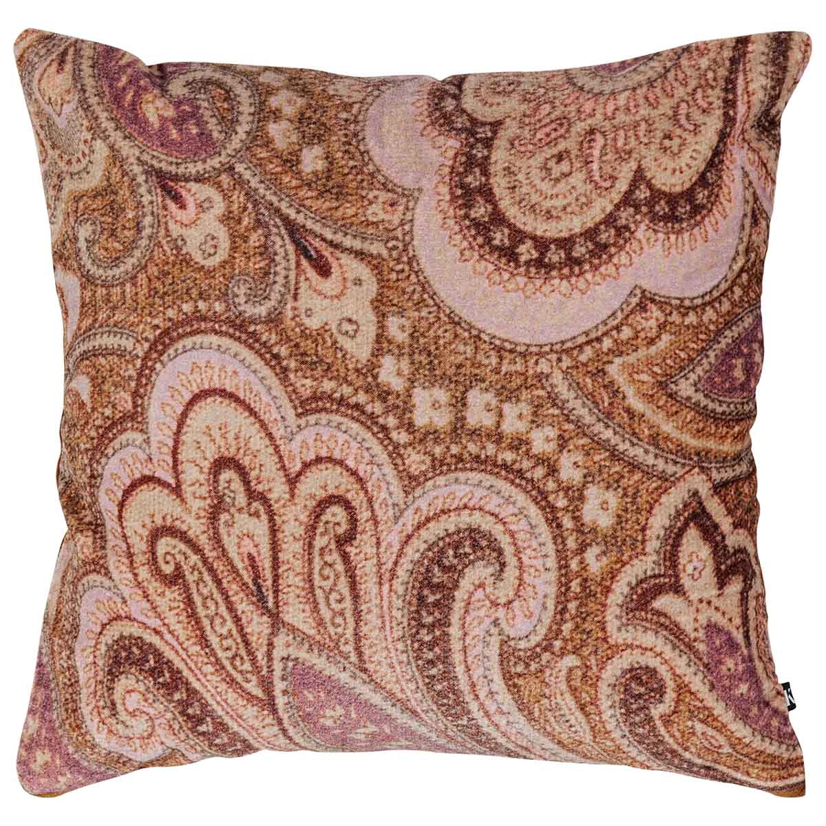 Velur pute med paisley mønster. Fargene går i rolig rosa og brunt, og gir puten et varmt uttrykk som passer ekstra godt til sesongen. Kombiner gjerne med flere puter i velur, eller miks inn andre teksturer som lin og bomull.