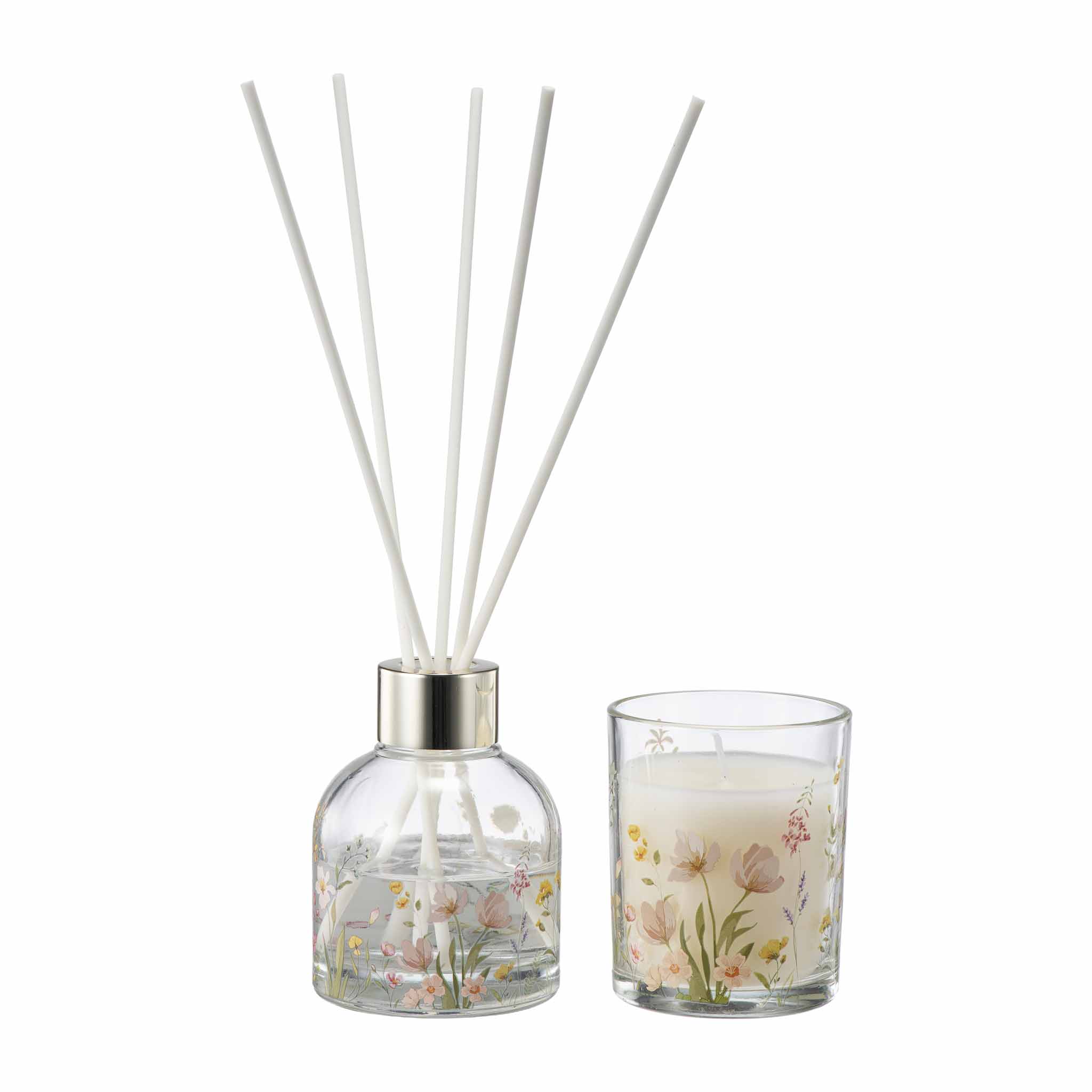Early Spring gavepakke består av en dekorativ duftpinner og et duftlys, begge i klart glass med et lett blomstermotiv. En hyggelig gave, eller et fint valg når du vil skape en lett og behagelig stemning hjemme.