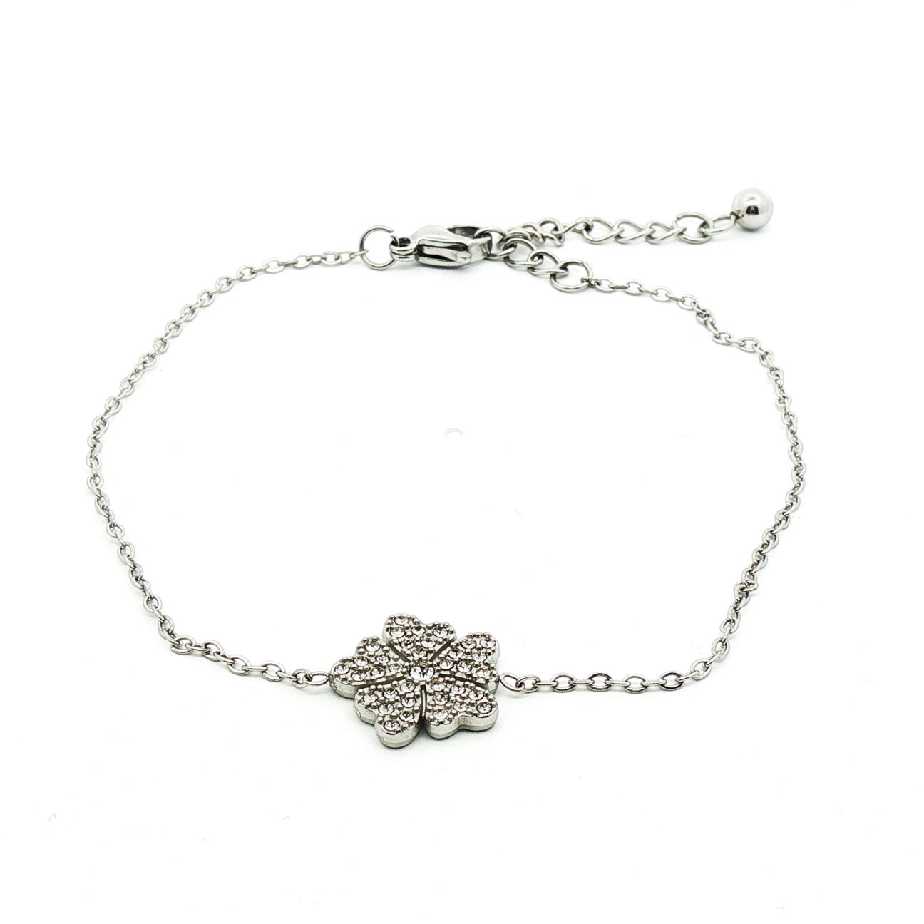 Lucky-charm…. Denne nydelige firkløveren med ett hav av krystaller er ett smykke du ikke kommer til å ta av deg. Og det trenger du ikke heller fordi denne er laget i stål og tåler vann, trening og parfyme.