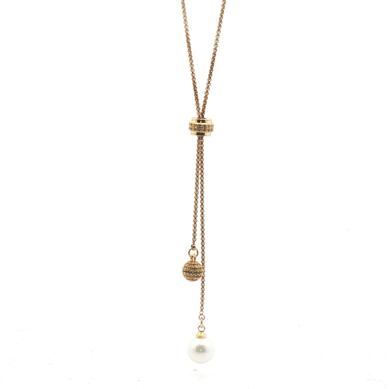 Edgy og kult langt kjede med glitrende perle. Kan brukes til både klassisk og røff stil. Gullbelagt stål som tåler trening, vann og parfyme..