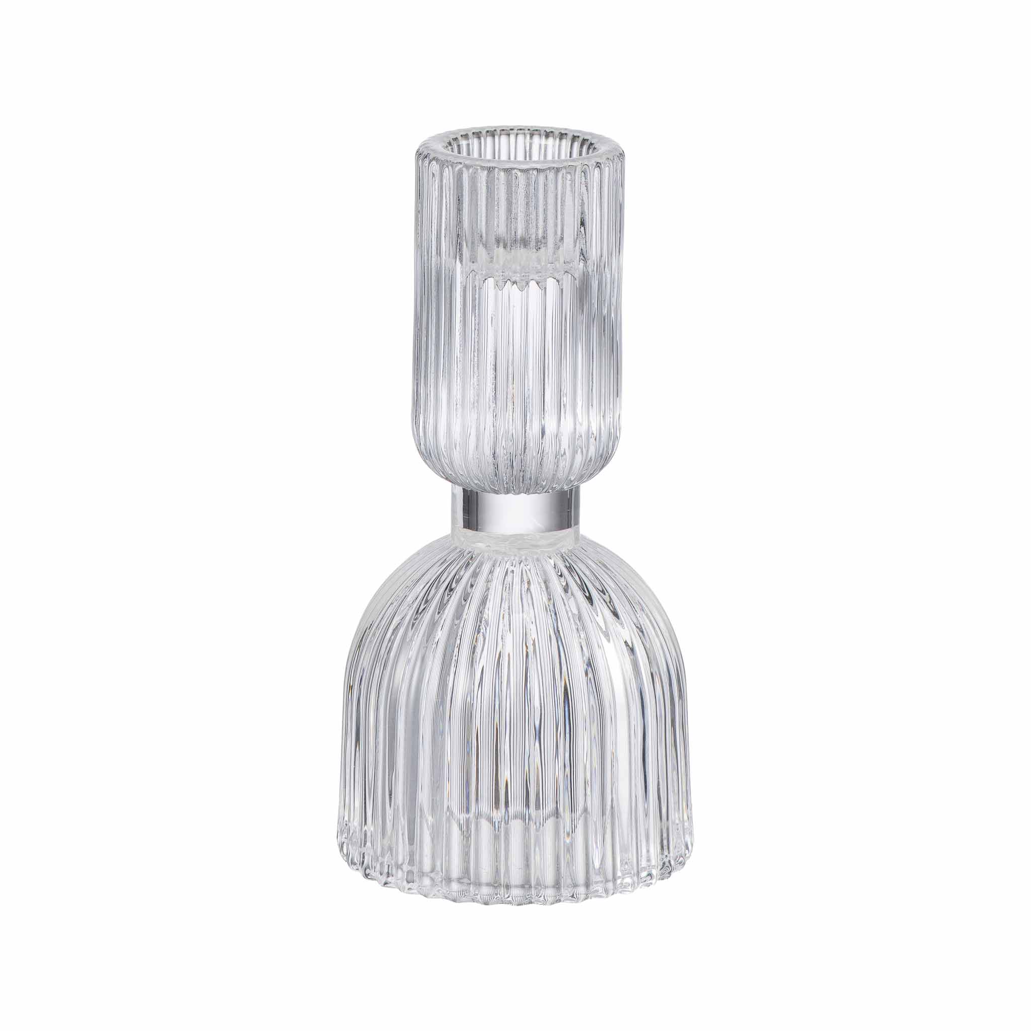 Lysestake i klart glass med riller for et moderne og stilfullt uttrykk. Finnes også i en mindre størrelse!