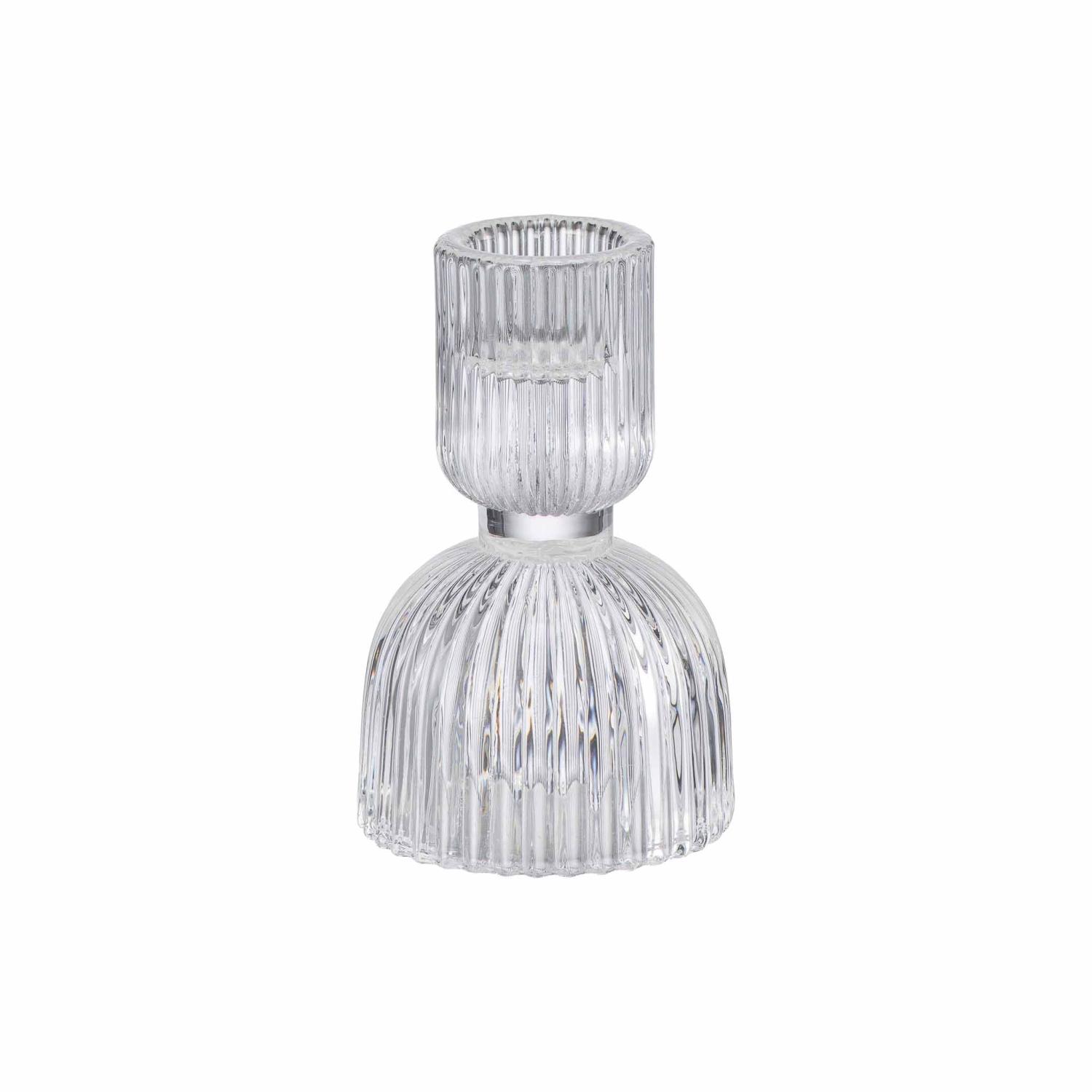 Elegant lysestake i klar glass med dekorative riller. Kombiner den gjerne med lysestake Vilde i 11 cm for et helhetlig uttrykk!