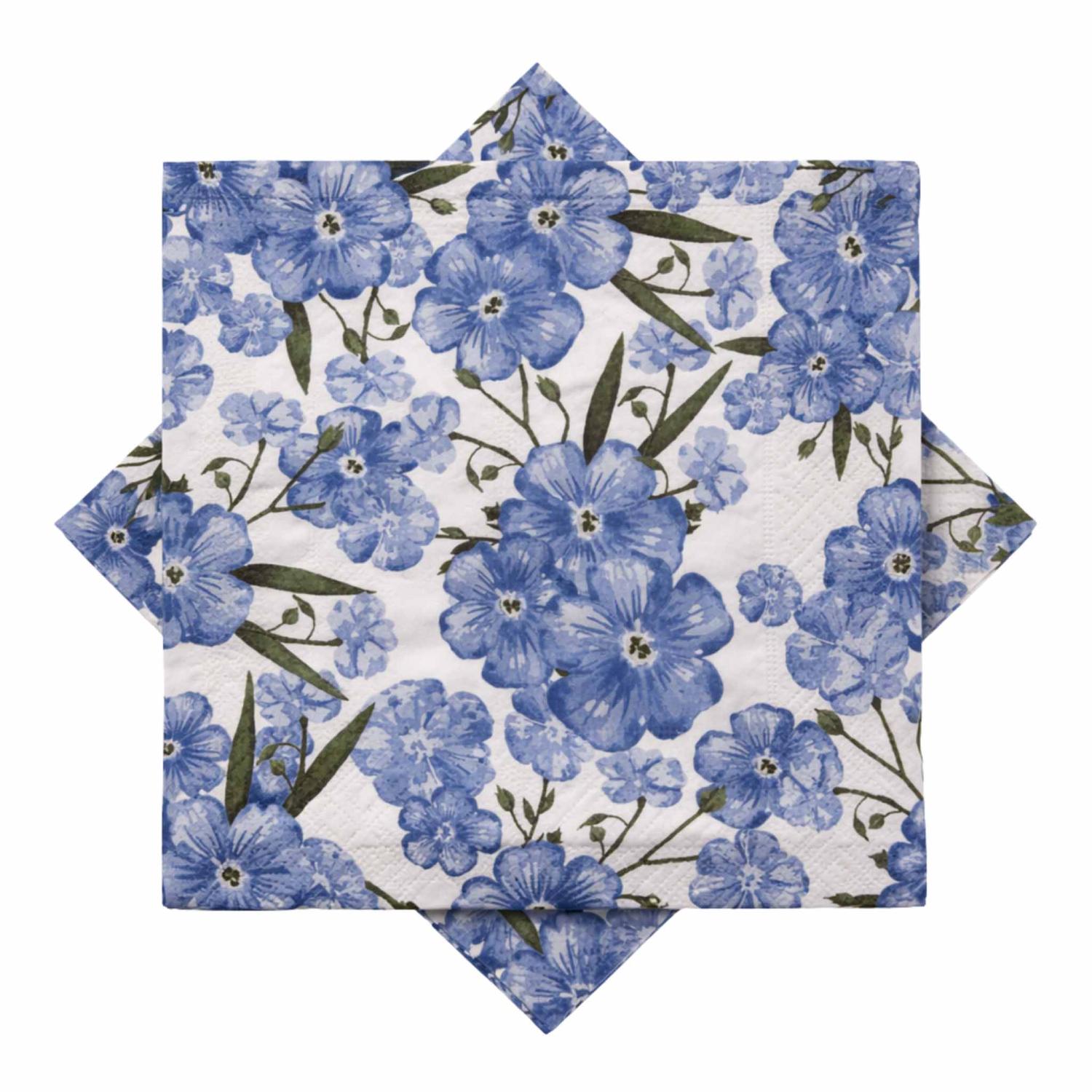 Papirserviett med fine blå blomster, som gir liv til borddekkingen. Perfekt til en sammenkomster som en dåp eller babyshower, men også fine til sommeren festligheter. Suppler med fint servise og dekkebrikker for en helhetlig borddekking.