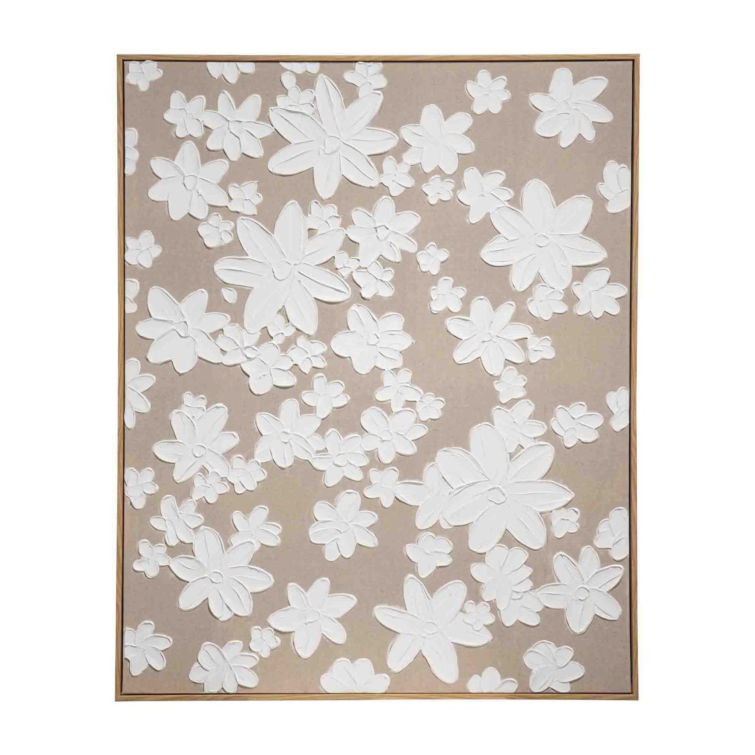 Et dekorativt bilde med hvite blomster som gir rommet et mykt uttrykk. Den lyse strukturen mot den lune bakgrunnen skaper et rolig blikkfang, og rammen løfter helheten på en fin måte. Perfekt på en vegg som trenger litt liv, alene eller i kombinasjon med annen kunst.