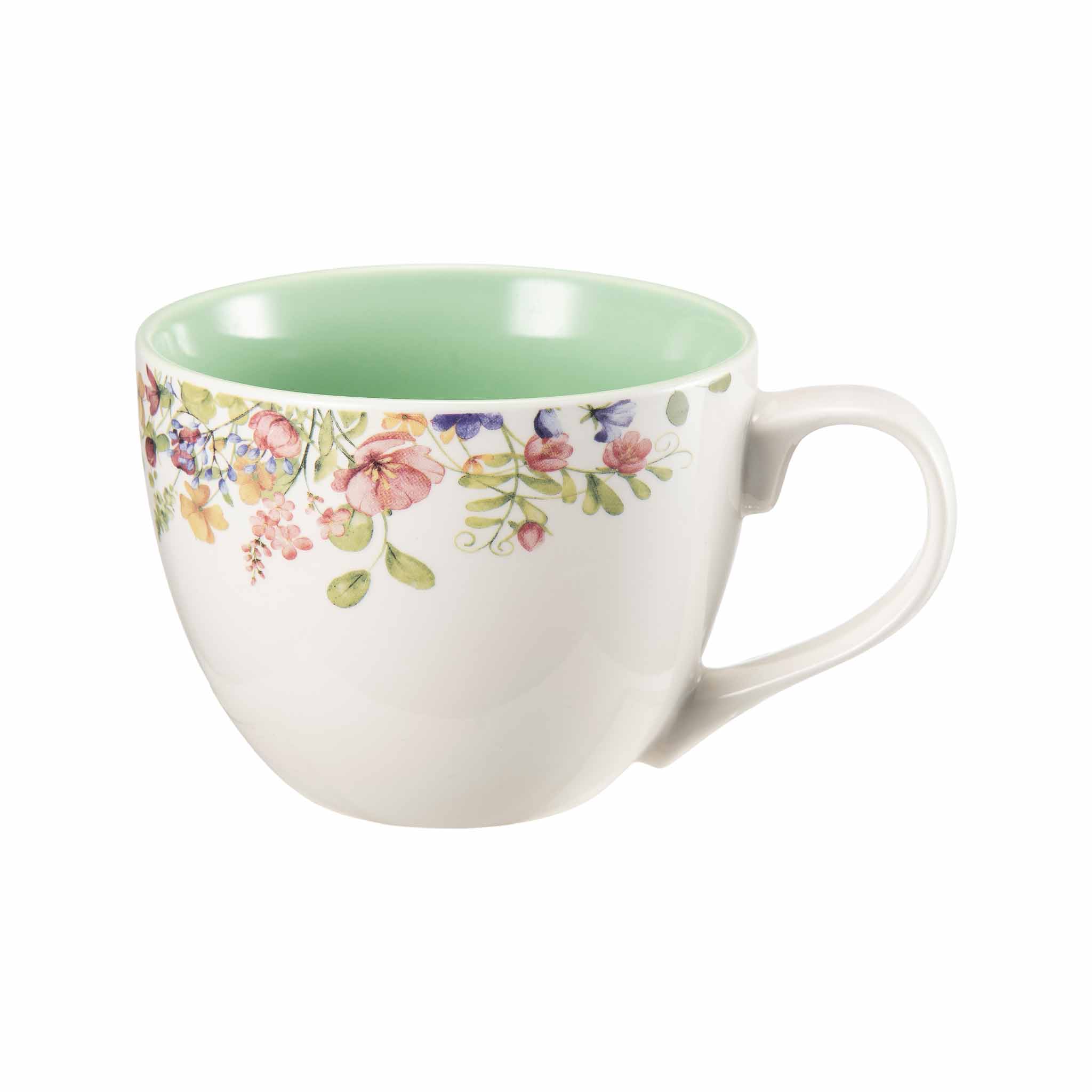 Kopp med blomsterdekor langs kanten og en myk grønn innside som gir et friskt uttrykk. Den runde formen ligger godt i hånden og passer like fint til morgenkaffen som til en rolig tepause. Dekk opp til frokost sammen med skål og asjett fra Våreng-serien.
