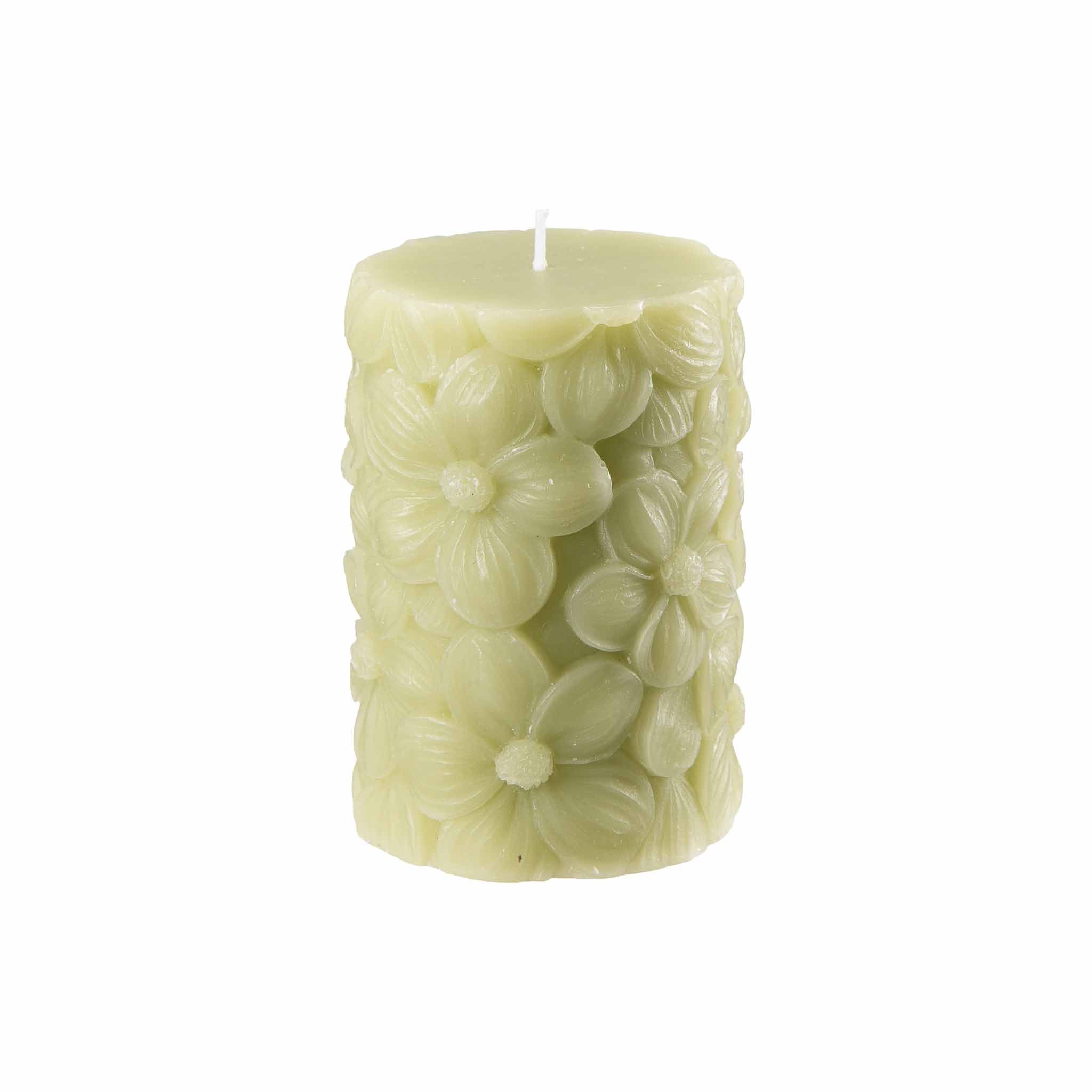 Et dekorativt kubbelys med vakre blomster. Den lyse grønntonen tilfører en frisk detalj sammen med andre lys på et lysfat eller bord.
