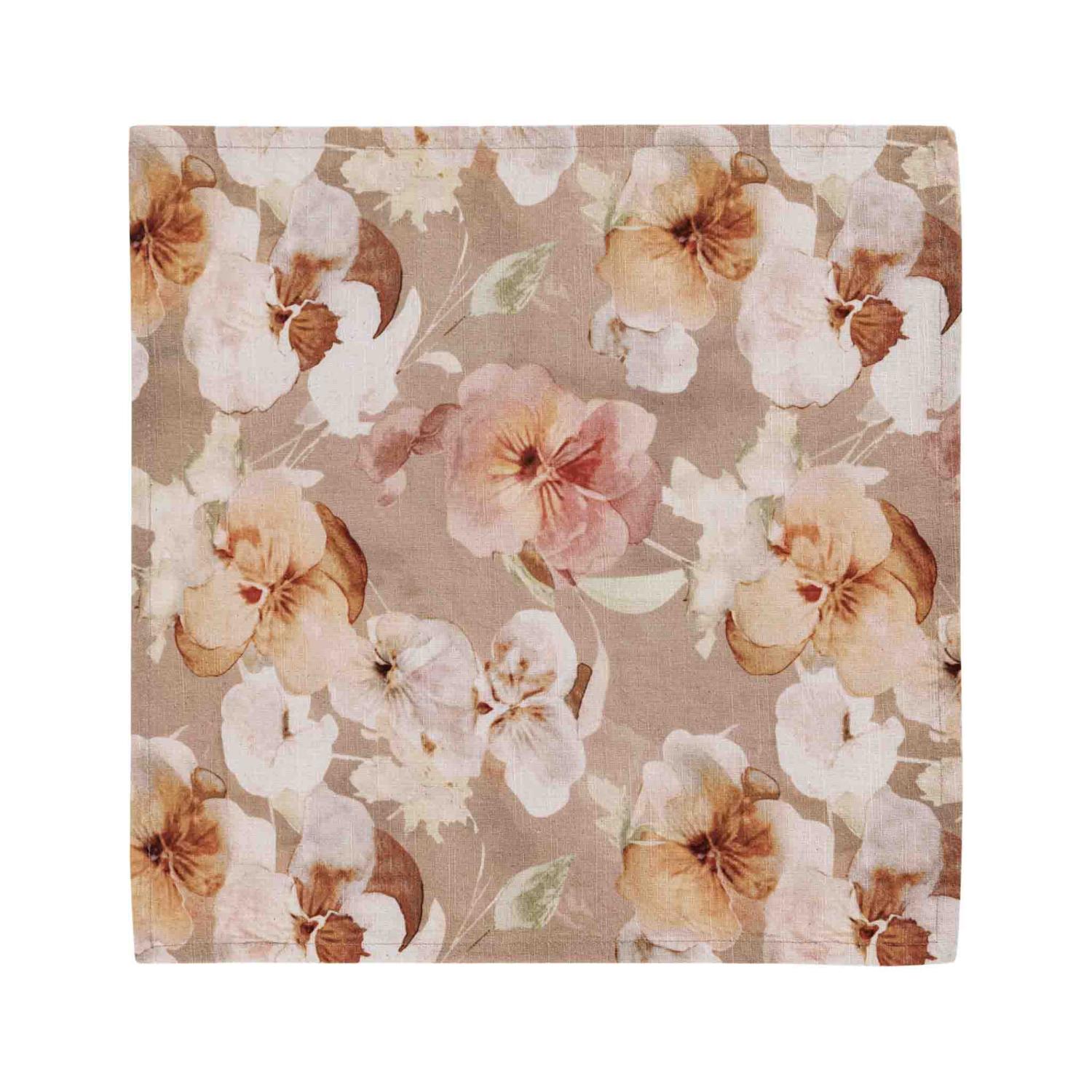 Denne tøyservietten har et mykt blomstertrykk i dempede nyanser av beige, rosa og varme bruntoner. Det lette uttrykket gir borddekkingen et rolig og gjennomført preg, enten den brukes til hverdags eller når bordet dekkes litt ekstra fint.