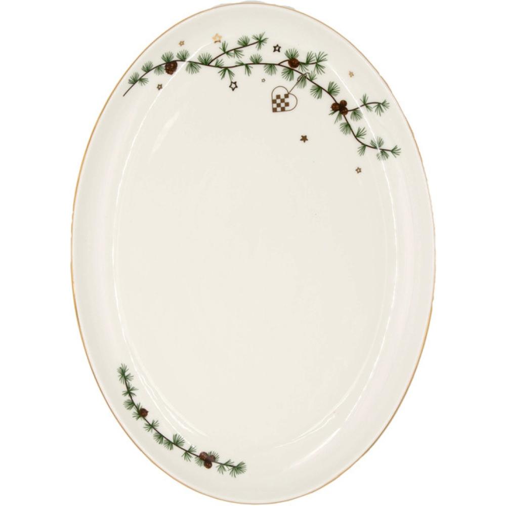 Elegant serveringsfat til dette populære juleservise fra Holmen, med klassisk julemotiv i grønt, gull og brunt. De fine detaljene med kongler, stjerner og julehjerte gir en varm og tradisjonell stemning til julemåltidet. Match gjerne med resten av serviset for en helhetlig borddekking.