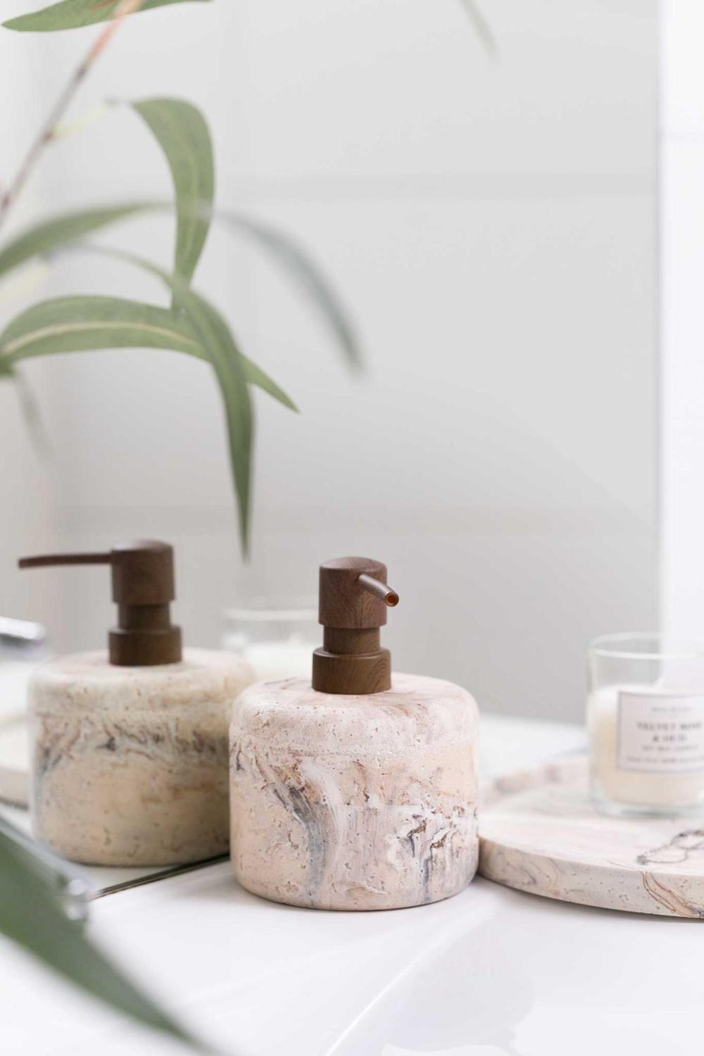 For de fine tingene som står fremme er fat, som for eksempel dette fatet i marmor, med på å skape et mer ryddig uttrykk på badet. Ved å samle løse deler til ett område blir ikke alt strødd utover benken, og det er enklere å holde rent.