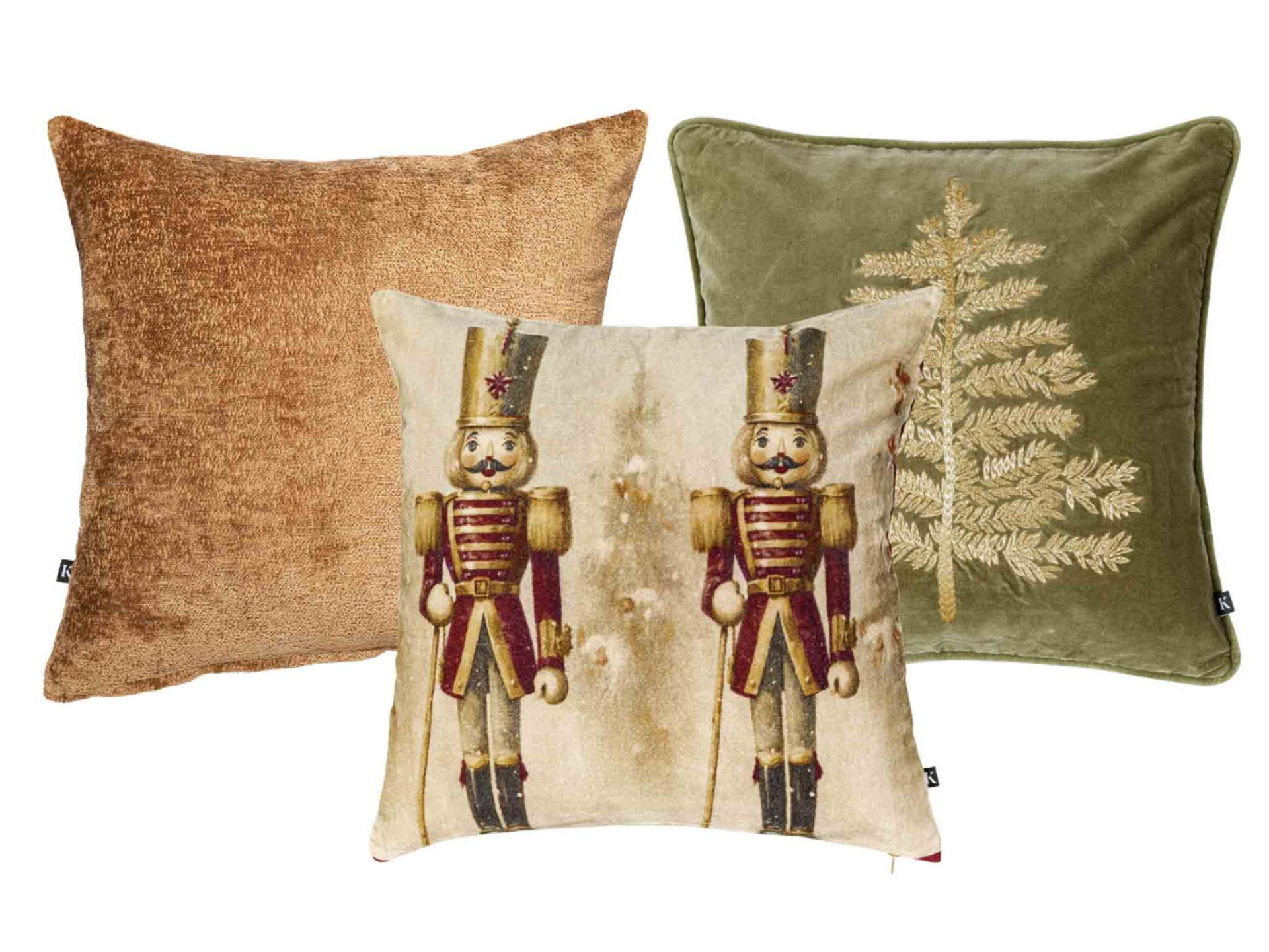 Denne kombinasjonen blander varm gullglød med nostalgisk julemagi. Den lekne nøtteknekker-puten skaper et eventyrlig midtpunkt, mens det grønne velurtrekket med brodert grantre gir et lunere og mer naturinspirert uttrykk. Den ensfargede gullputen binder helheten sammen og tilfører et elegant og harmonisk preg. Sammen gir de stuen en klassisk og magisk julefølelse.