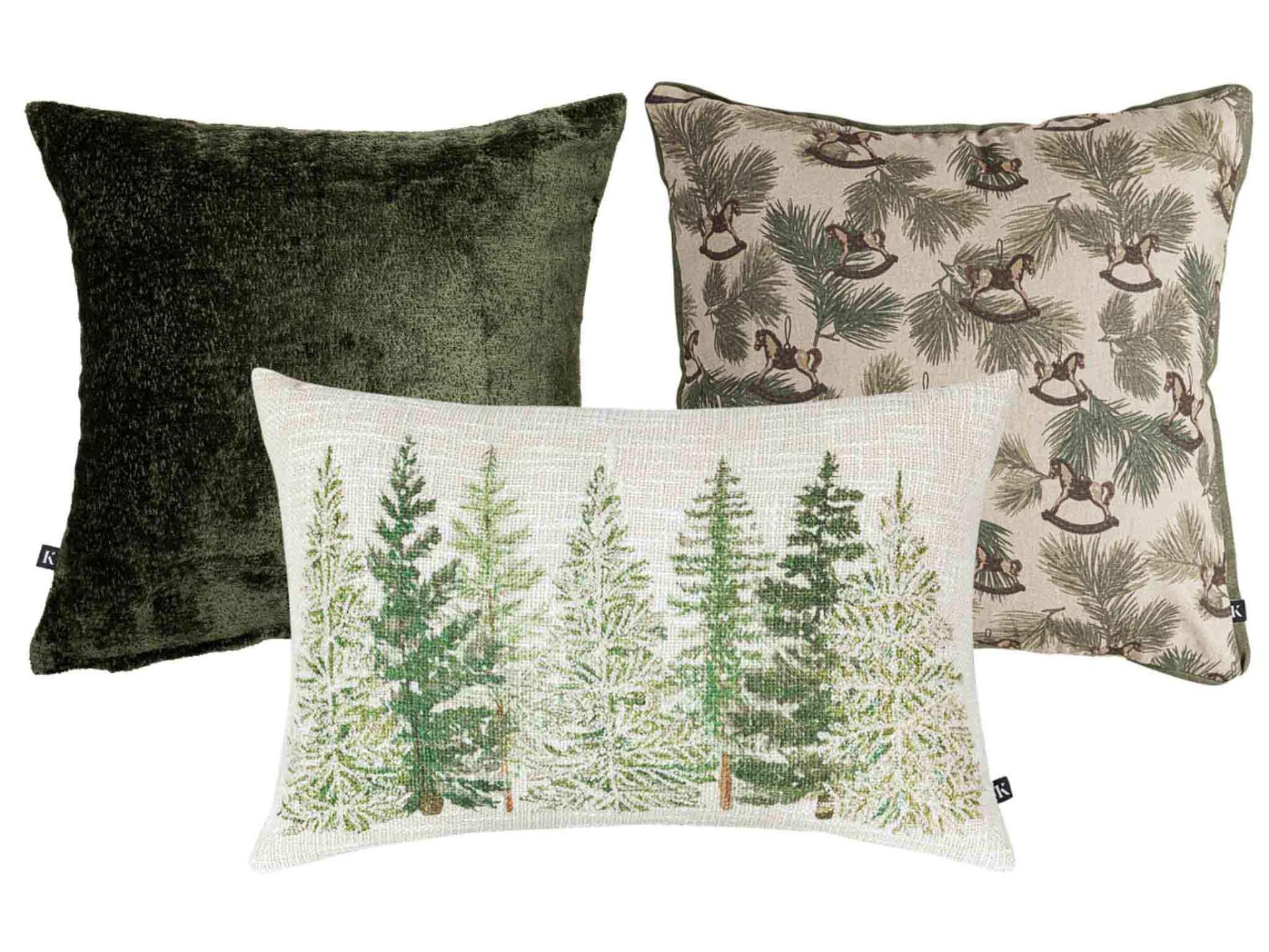Hent inspirasjon fra vinterens stille skog og klassisk julehygge. Putetrekket med granmotiver skaper en rolig og eventyrlig atmosfære, mens trekket med gyngehester gir et nostalgisk preg av tradisjon og barndomsminner. Den dype grønne velurputen tilfører varme og fylde som balanserer uttrykket. Perfekt for deg som ønsker en naturlig og stemningsfull jul med et hint av skogssjarm.