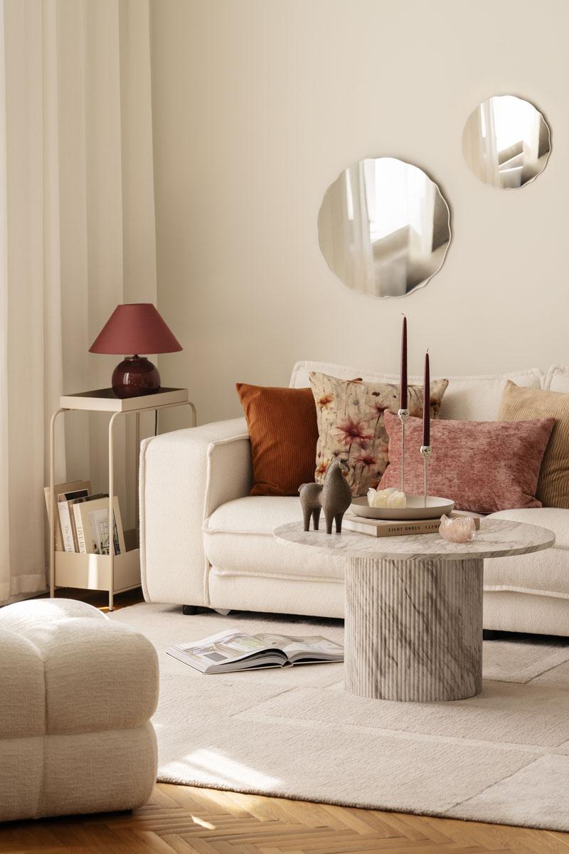 - Luksuriøse tekstiler: velur, faux fur og chenille gir sanselige flater og øyeblikkelig komfort.