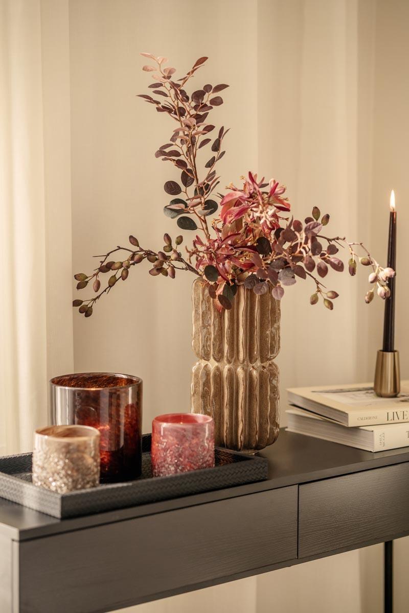 - Interiørdetaljer som vaser i farget glass (husk frodige buketter), lysfat og lysestaker i matte farger og speiloverflater.