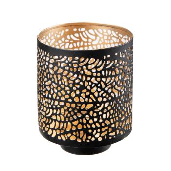 Lekker telysholder i metall. Lykten er sort på utsiden og gull på innsiden, mønsteret skaper et varmt og vakkert spill av lys fra telysflammen.