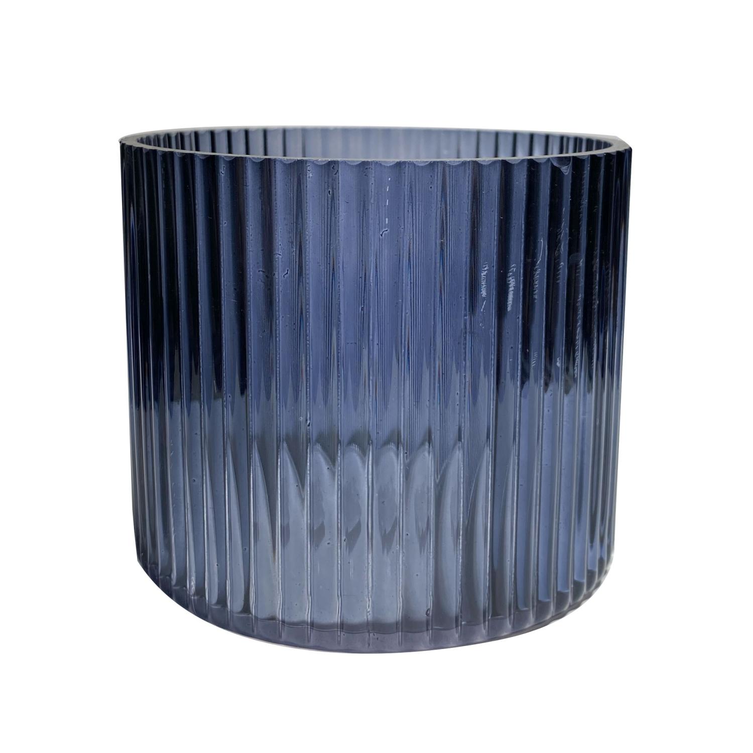 Blått telysglass med lekre riller. Nydelig å sette på bordet, enten ute eller inne, og sett gjerne strå eller blomster oppi. Gir et lekkert skyggespill av rillene rundt.