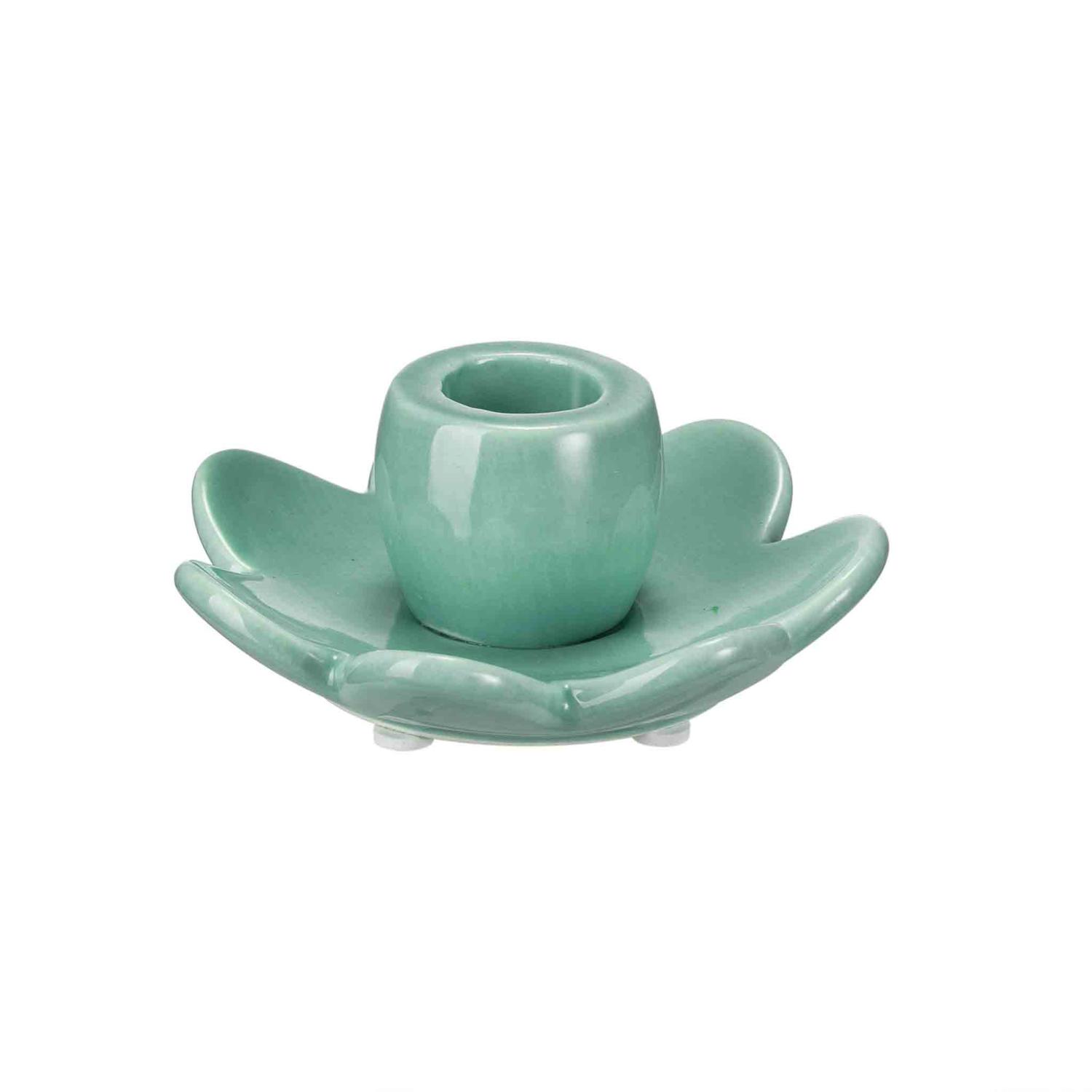 Lys grønn lysestake i shiny keramikk formet som en blomst.