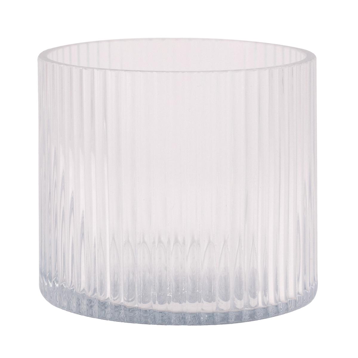 Telysholder i klart glass med lekre riller. Nydelig å sette på bordet, enten ute eller inne, og sett gjerne strå eller blomster oppi for et annet uttrykk. Gir et lekkert skyggespill av rillene rundt når lys tennes.