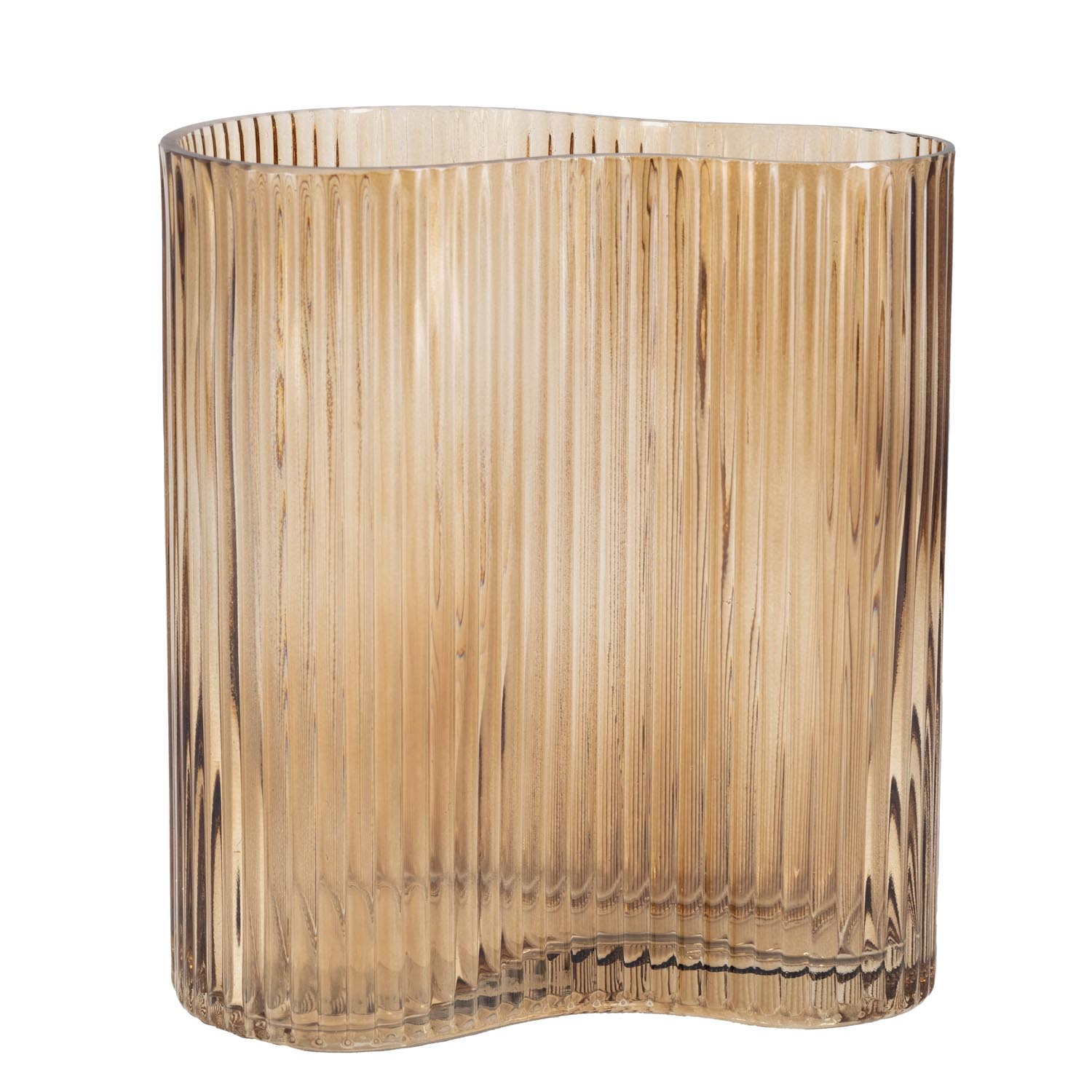 Lekker, høy og romslig vase i amberfarget glass med riller. Trendy organisk form og nydelig å sette på bordet med lekre strå, blomster eller planter i.