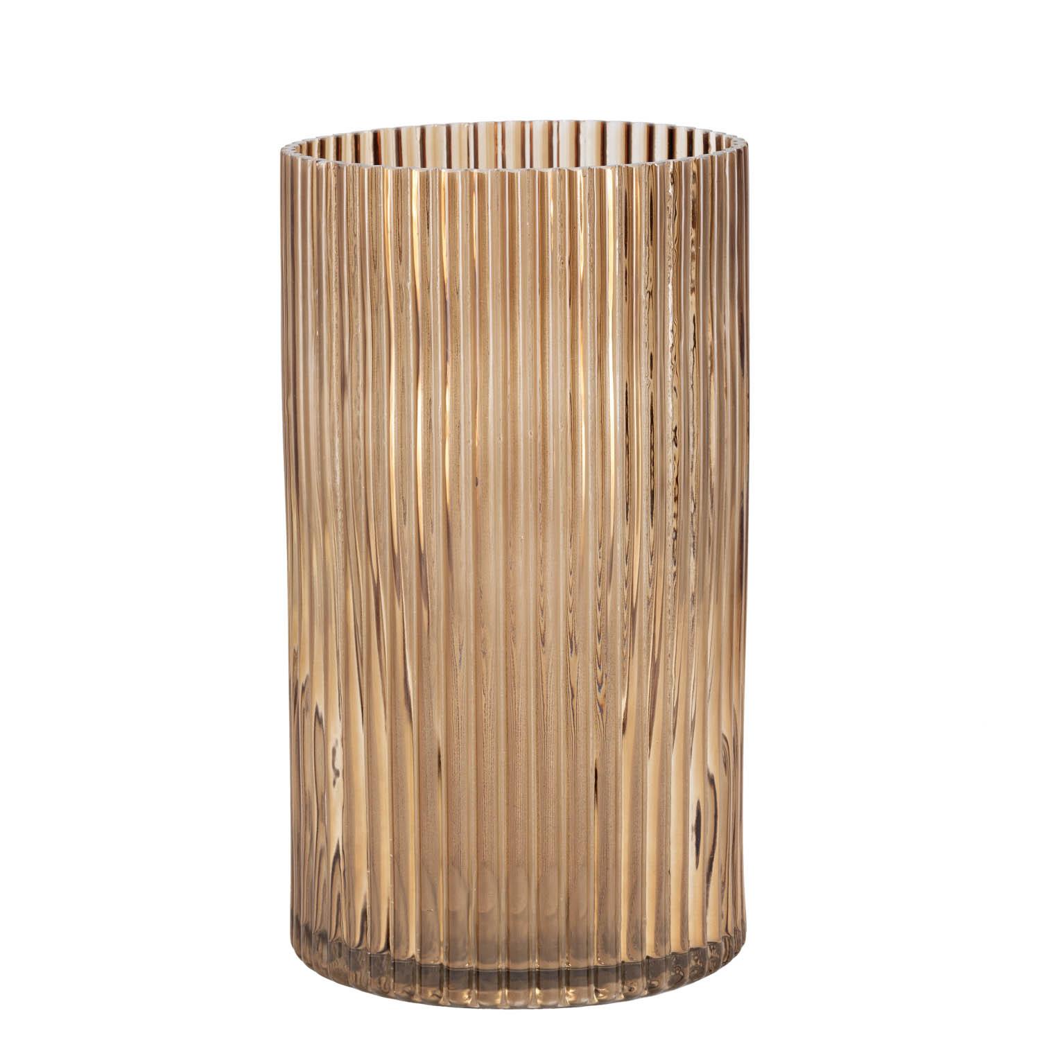 Lekker, høy vase i amberfarget glass med riller. Nydelig å sette på bordet med lekre strå, blomster eller planter i.
