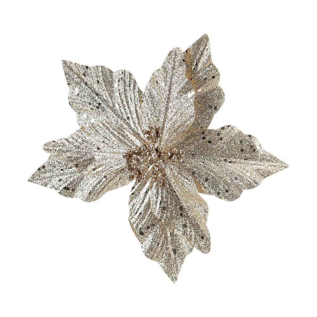 Legg til en touch av eleganse i ditt juletre med vår vakre blomst på klype i gull. Denne delikate juletredekoren kombinerer luksuriøs gullfarge med en naturlig blomsterdesign.