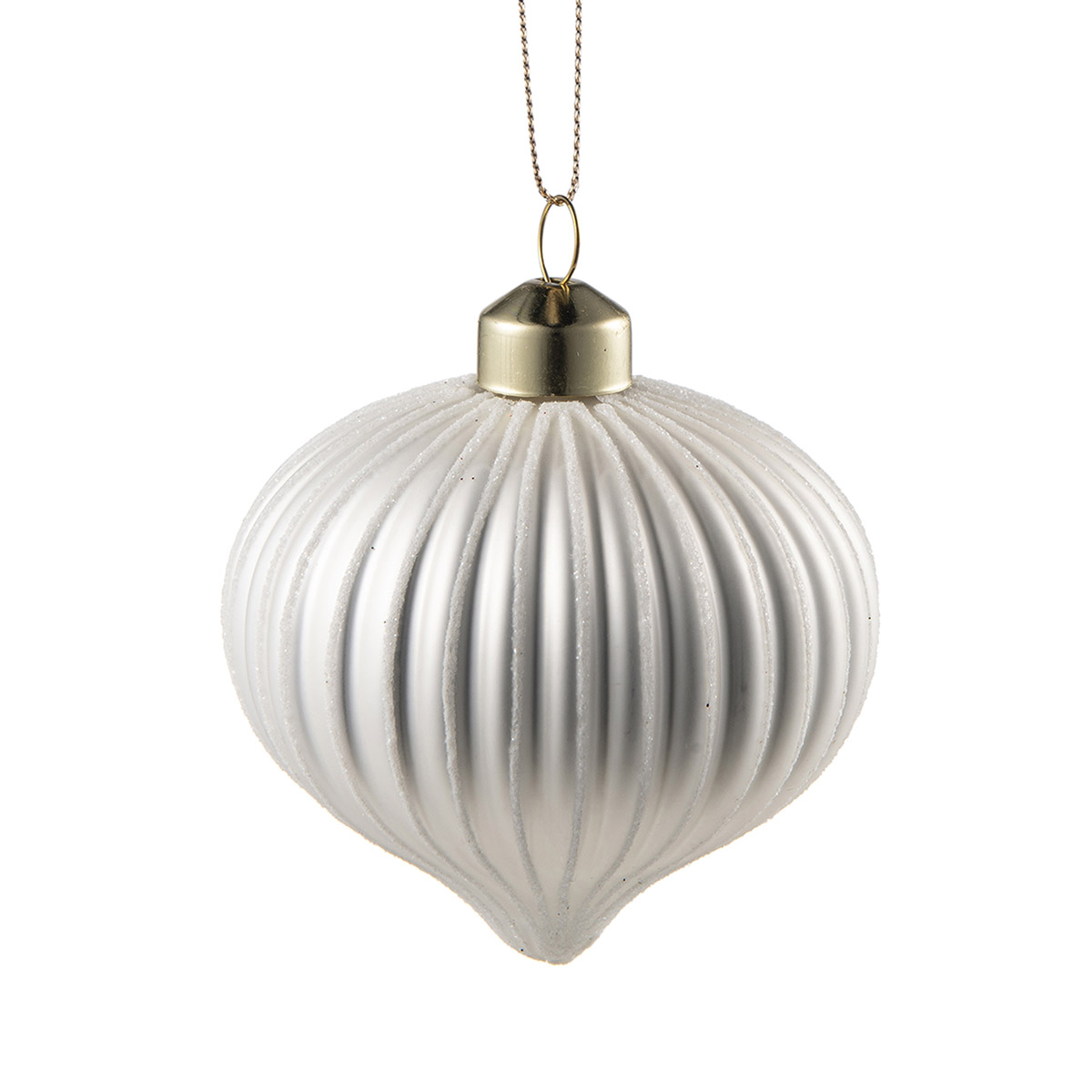 Nydelig hvit julekule i glass med riller. Morsom og leken form som passer perfekt på juletreet denne julen. Frisk opp og pynt et tre som gjenspeiler din smak og personlighet. Kombiner den gjerne med de andre fargene av julekule dråpe.