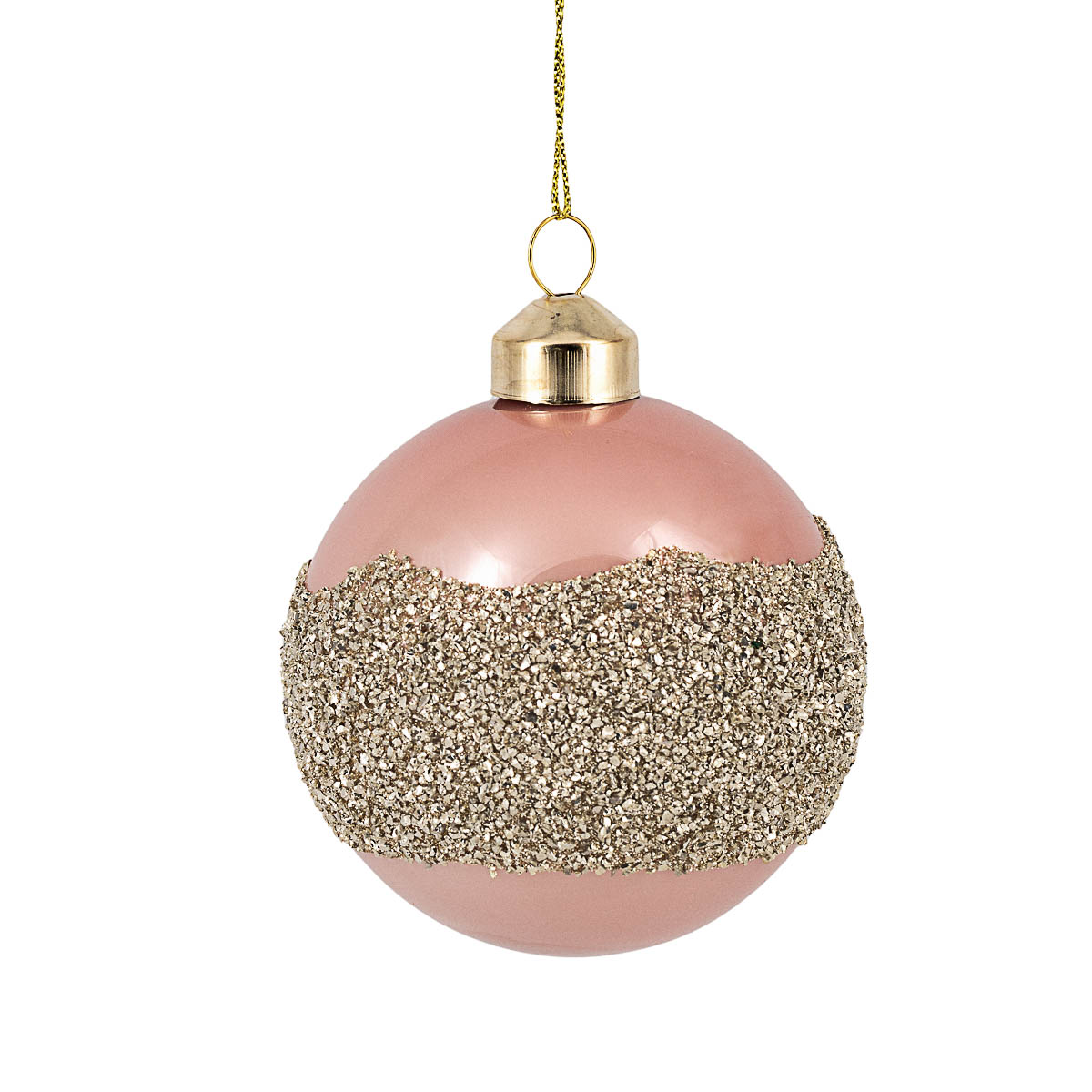 Nydelig julekule i rosa glass med belte av gullfarget glitter. Frisk opp og pynt et tre som gjenspeiler din smak og personlighet. Kombiner gjerne med julekuler i gull eller brunt.